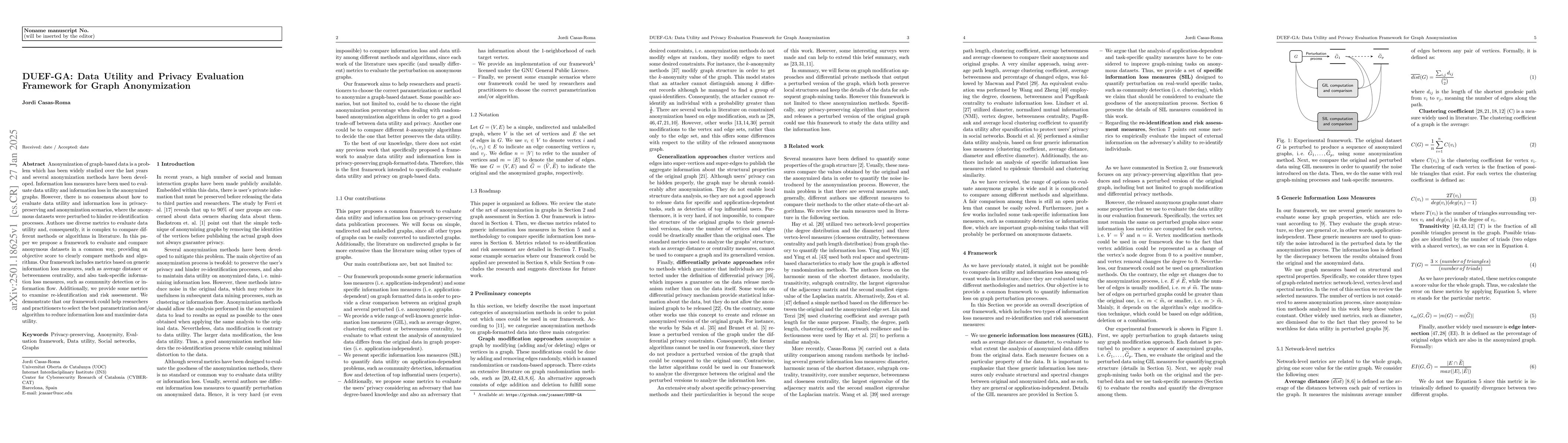 This paper proposes a comprehensive framework called DUEF-GA to evaluate data utility and privacy in graph anonymization. It standardizes metrics for comparing anonymization methods, incorporating both generic and task-specific information loss measures, and also assesses re-identification risks to aid researchers in optimizing algorithms for minimal information loss and maximal utility.