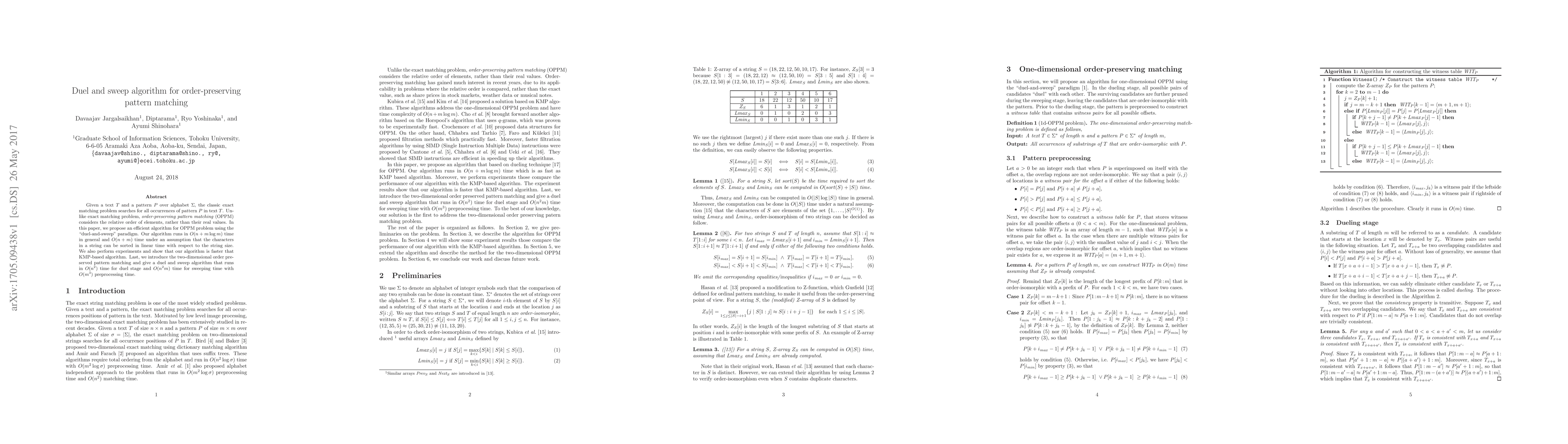 Given a text $T$ and a pattern $P$ over alphabet $\Sigma$, the classic exact matching problem searches for all occurrences of pattern $P$ in text $T$. Unlike exact matching problem, order-preserving pattern matching (OPPM) considers the relative order of elements, rather than their real values. In this paper, we propose an efficient algorithm for OPPM problem using the "duel-and-sweep" paradigm. Our algorithm runs in $O(n + m\log m)$ time in general and $O(n + m)$ time under an assumption that the characters in a string can be sorted in linear time with respect to the string size. We also perform experiments and show that our algorithm is faster that KMP-based algorithm. Last, we introduce the two-dimensional order preserved pattern matching and give a duel and sweep algorithm that runs in $O(n^2)$ time for duel stage and $O(n^2 m)$ time for sweeping time with $O(m^3)$ preprocessing time.