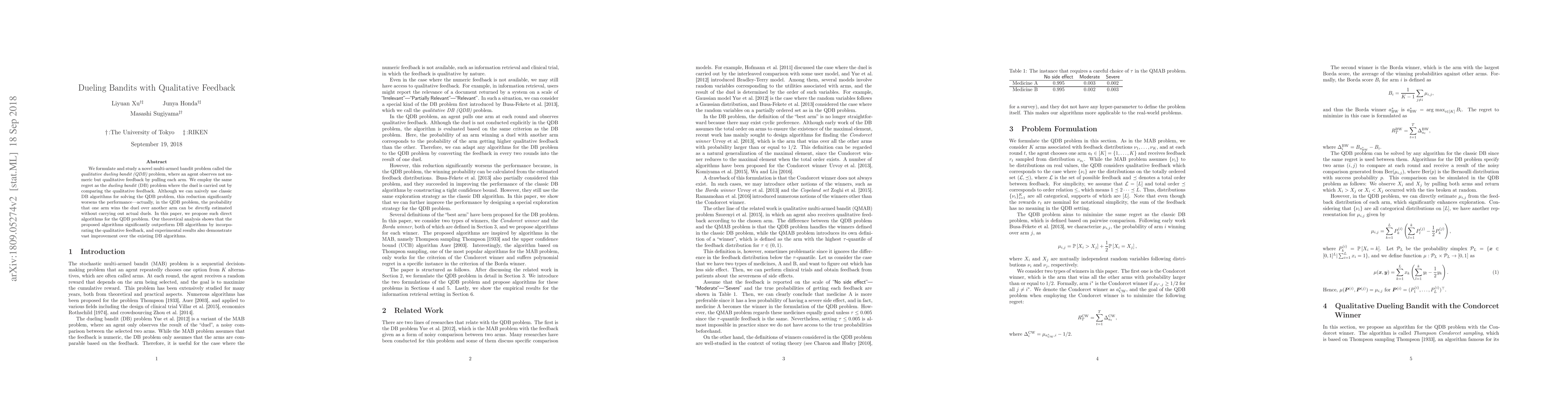 We formulate and study a novel multi-armed bandit problem called the qualitative dueling bandit (QDB) problem, where an agent observes not numeric but qualitative feedback by pulling each arm. We employ the same regret as the dueling bandit (DB) problem where the duel is carried out by comparing the qualitative feedback. Although we can naively use classic DB algorithms for solving the QDB problem, this reduction significantly worsens the performance---actually, in the QDB problem, the probability that one arm wins the duel over another arm can be directly estimated without carrying out actual duels. In this paper, we propose such direct algorithms for the QDB problem. Our theoretical analysis shows that the proposed algorithms significantly outperform DB algorithms by incorporating the qualitative feedback, and experimental results also demonstrate vast improvement over the existing DB algorithms.