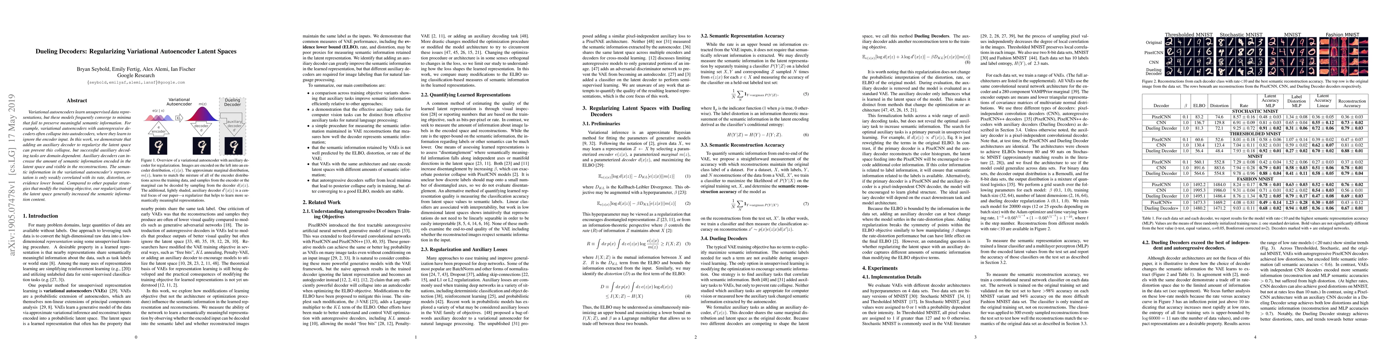 Variational autoencoders learn unsupervised data representations, but these models frequently converge to minima that fail to preserve meaningful semantic information. For example, variational autoencoders with autoregressive decoders often collapse into autodecoders, where they learn to ignore the encoder input. In this work, we demonstrate that adding an auxiliary decoder to regularize the latent space can prevent this collapse, but successful auxiliary decoding tasks are domain dependent. Auxiliary decoders can increase the amount of semantic information encoded in the latent space and visible in the reconstructions. The semantic information in the variational autoencoder's representation is only weakly correlated with its rate, distortion, or evidence lower bound. Compared to other popular strategies that modify the training objective, our regularization of the latent space generally increased the semantic information content.