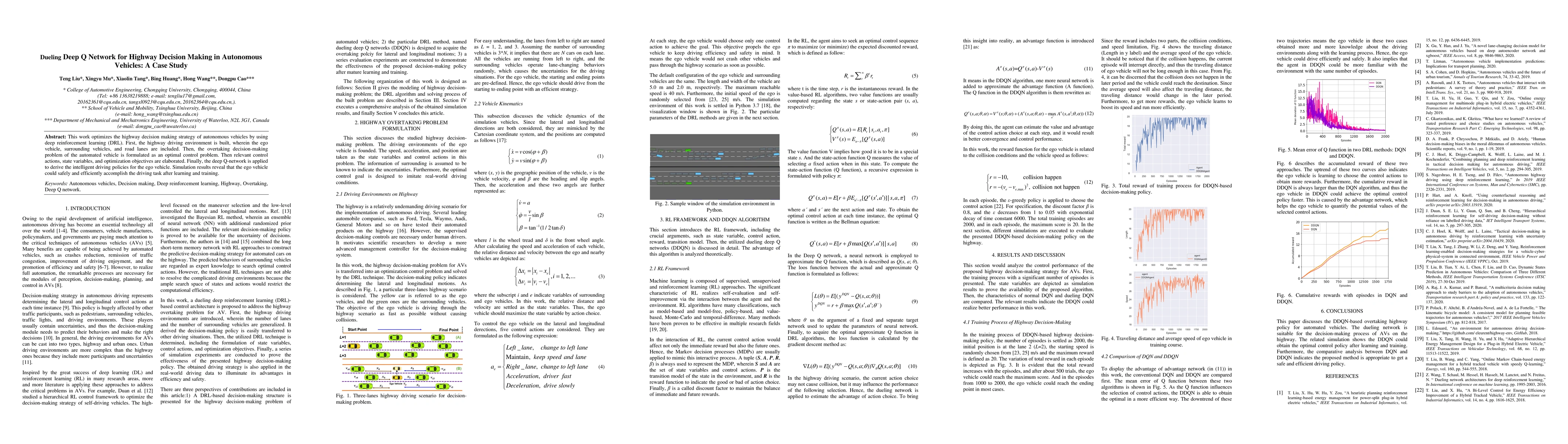 This research optimizes highway decision making for autonomous vehicles using a Dueling Deep Q Network (DDQN), successfully training the vehicle to safely and efficiently perform overtaking maneuvers through reinforcement learning. Simulation results demonstrate the effectiveness of the proposed approach.