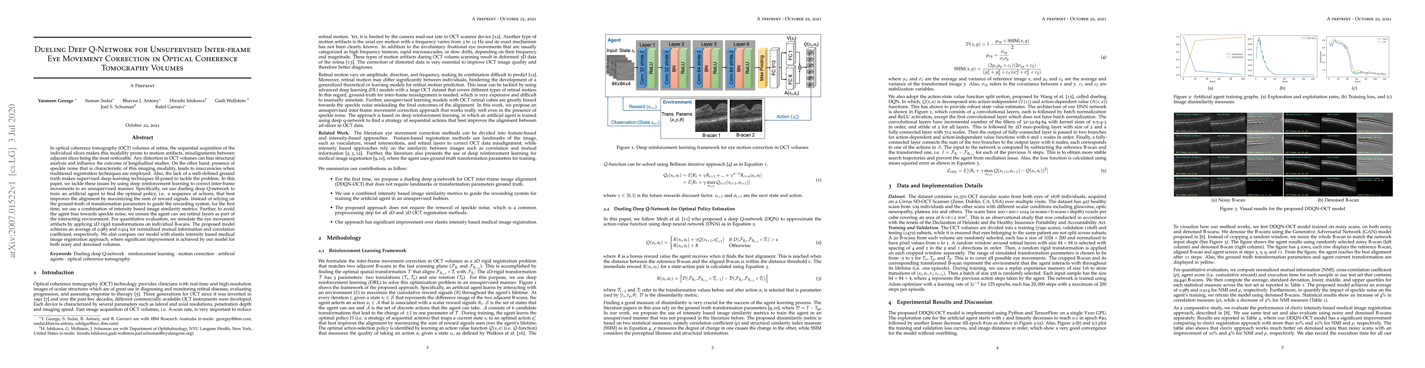 This paper proposes a dueling deep Q-network for unsupervised correction of inter-frame eye movement artifacts in OCT volumes, using reinforcement learning to optimize alignment without ground truth. The model achieves superior quantitative results compared to traditional registration methods.