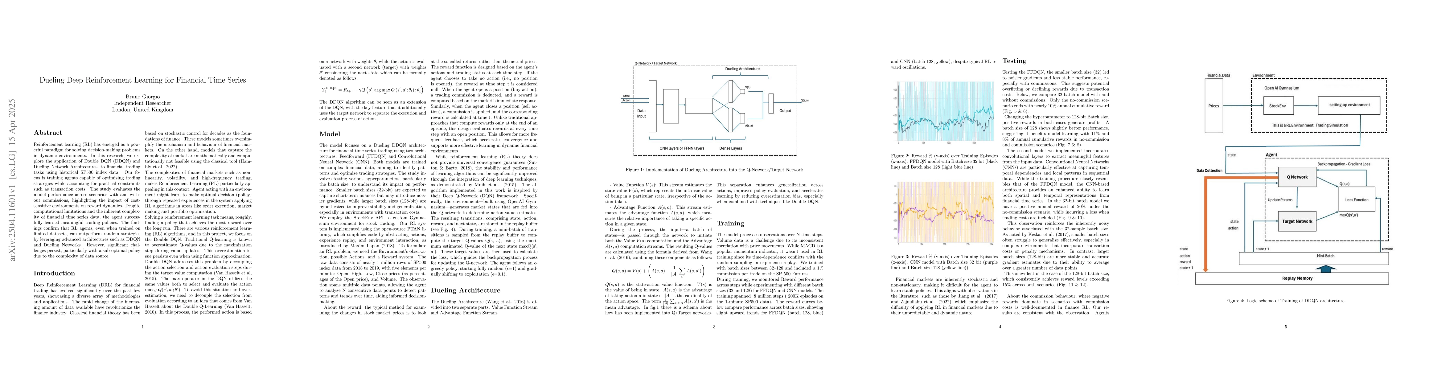 The research applies Double Deep Q-Network (DDQN) and Dueling Network Architectures to financial trading tasks using historical S&P500 index data, training agents to optimize trading strategies while considering practical constraints like transaction costs.