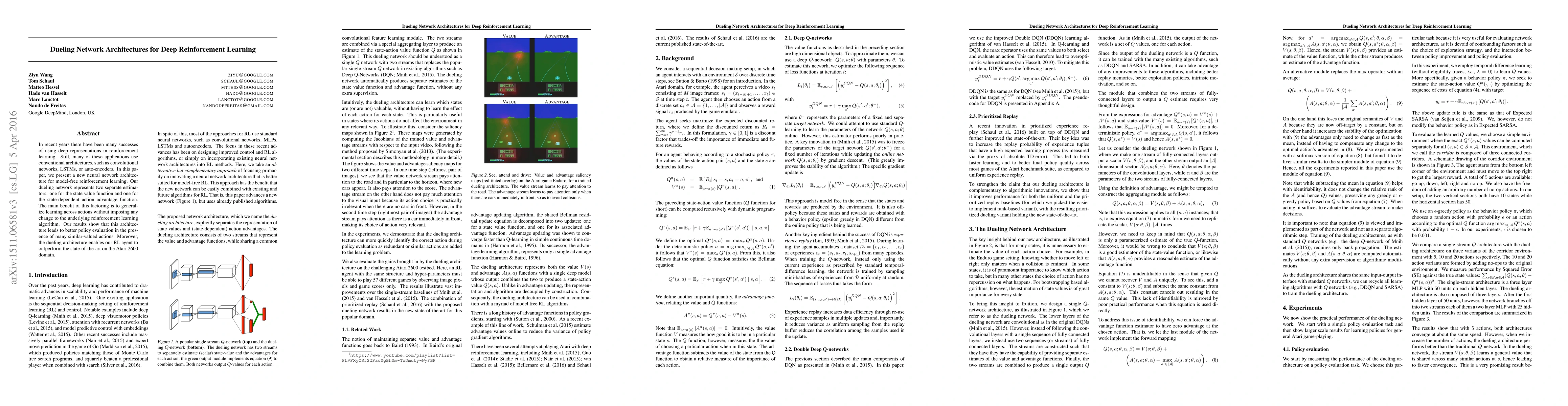 This paper introduces a dueling network architecture for deep reinforcement learning that separates value and advantage functions, improving policy evaluation and performance, especially in environments with many similar-valued actions. The dueling architecture outperforms state-of-the-art methods on the Atari 2600 domain.