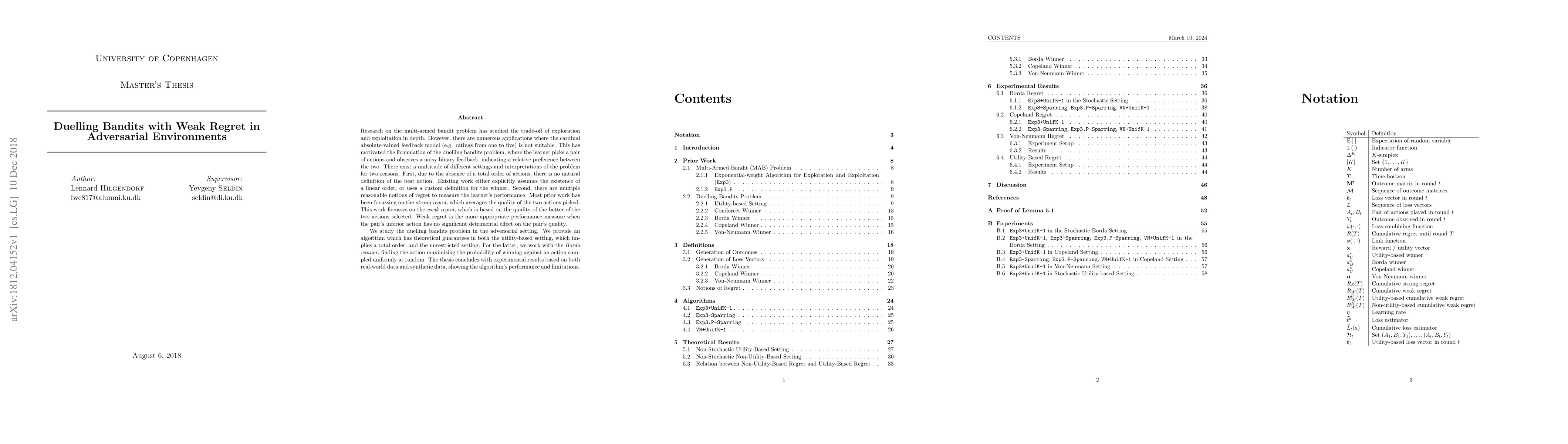 Research on the multi-armed bandit problem has studied the trade-off of exploration and exploitation in depth. However, there are numerous applications where the cardinal absolute-valued feedback model (e.g. ratings from one to five) is not suitable. This has motivated the formulation of the duelling bandits problem, where the learner picks a pair of actions and observes a noisy binary feedback, indicating a relative preference between the two. There exist a multitude of different settings and interpretations of the problem for two reasons. First, due to the absence of a total order of actions, there is no natural definition of the best action. Existing work either explicitly assumes the existence of a linear order, or uses a custom definition for the winner. Second, there are multiple reasonable notions of regret to measure the learner's performance. Most prior work has been focussing on the $\textit{strong regret}$, which averages the quality of the two actions picked. This work focusses on the $\textit{weak regret}$, which is based on the quality of the better of the two actions selected. Weak regret is the more appropriate performance measure when the pair's inferior action has no significant detrimental effect on the pair's quality. We study the duelling bandits problem in the adversarial setting. We provide an algorithm which has theoretical guarantees in both the utility-based setting, which implies a total order, and the unrestricted setting. For the latter, we work with the $\textit{Borda winner}$, finding the action maximising the probability of winning against an action sampled uniformly at random. The thesis concludes with experimental results based on both real-world data and synthetic data, showing the algorithm's performance and limitations.