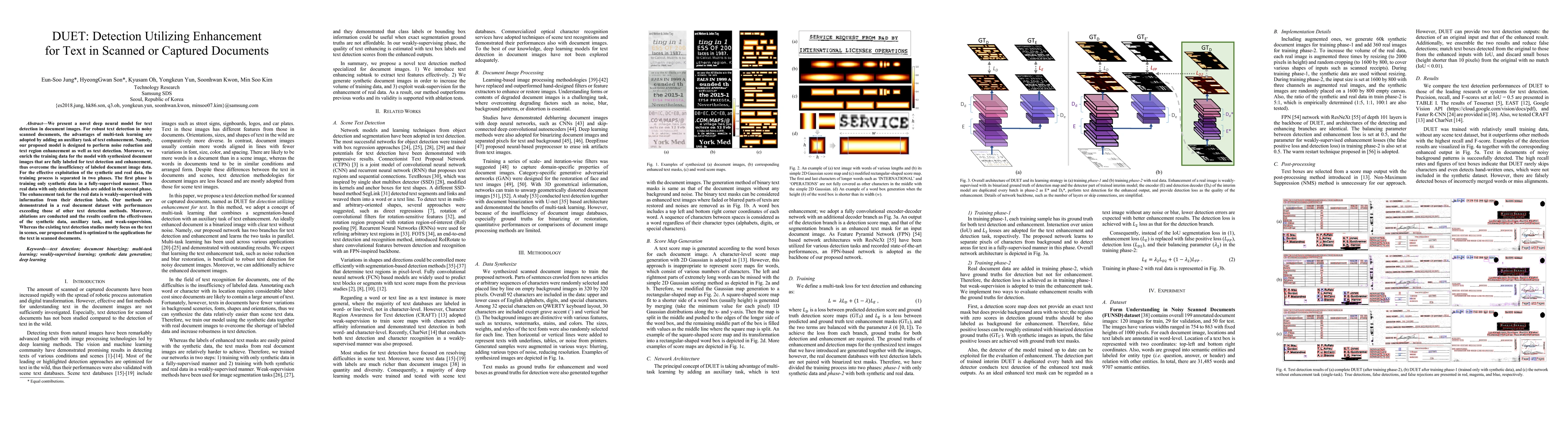 This paper introduces a deep neural model for text detection in scanned documents, utilizing multi-task learning with an auxiliary text enhancement task to improve robustness. The model is trained in two phases: first with synthetic data, then with real data using weak supervision, achieving superior performance compared to other methods.