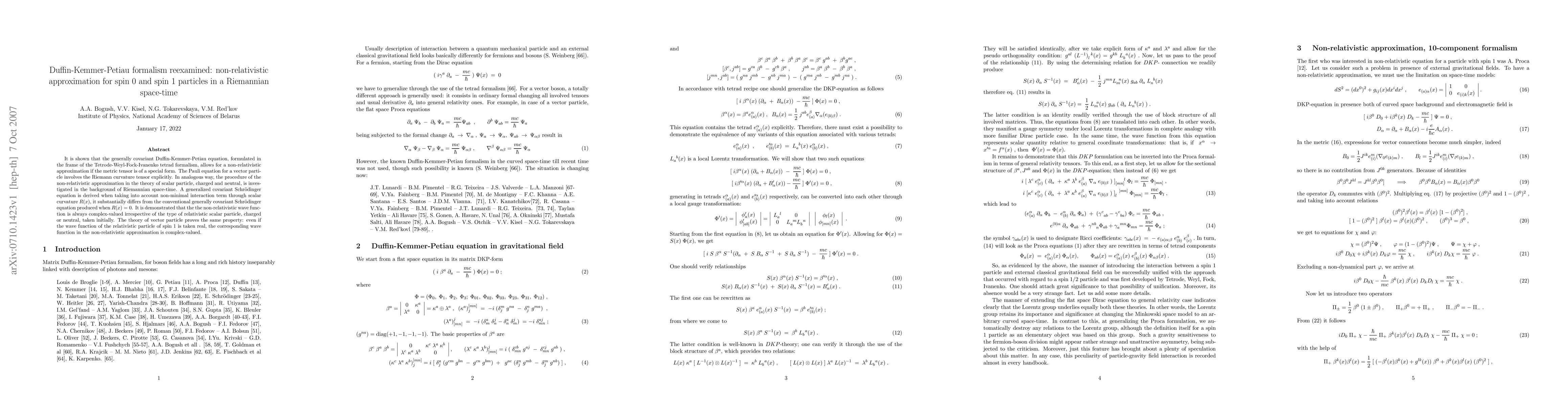It is shown that the generally covariant Duffin-Kemmer-Petiau equation, formulated in the frame of the Tetrode-Weyl-Fock-Ivanenko tetrad formalism, allows for a non-relativistic approximation if the metric tensor is of a special form. The Pauli equation for a vector particle involves the Riemann curvature tensor explicitly. In analogous way, the procedure of the non-relativistic approximation in the theory of scalar particle, charged and neutral, is investigated in the background of Riemannian space-time. A generalized covariant Schrodinger equation is derived when taking into account non-minimal interaction term through scalar curvature R(x), it substantially differs from the conventional generally covariant Schrodinger equation produced when R(x)=0. It is demonstrated that the the non-relativistic wave function is always complex-valued irrespective of the type of relativistic scalar particle, charged or neutral, taken initially. The theory of vector particle proves the same property: even if the wave function of the relativistic particle of spin 1 is taken real,the corresponding wave function in the non-relativistic approximation is complex-valued.