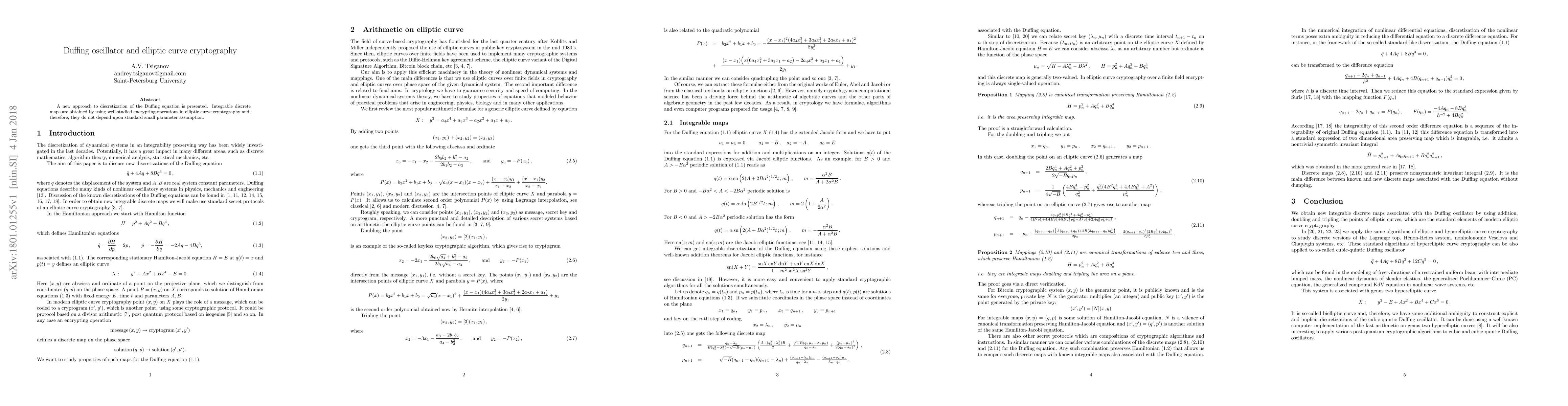 This paper introduces a novel method for discretizing the Duffing oscillator equation using operations from elliptic curve cryptography, resulting in integrable discrete maps that do not rely on traditional small parameter assumptions.