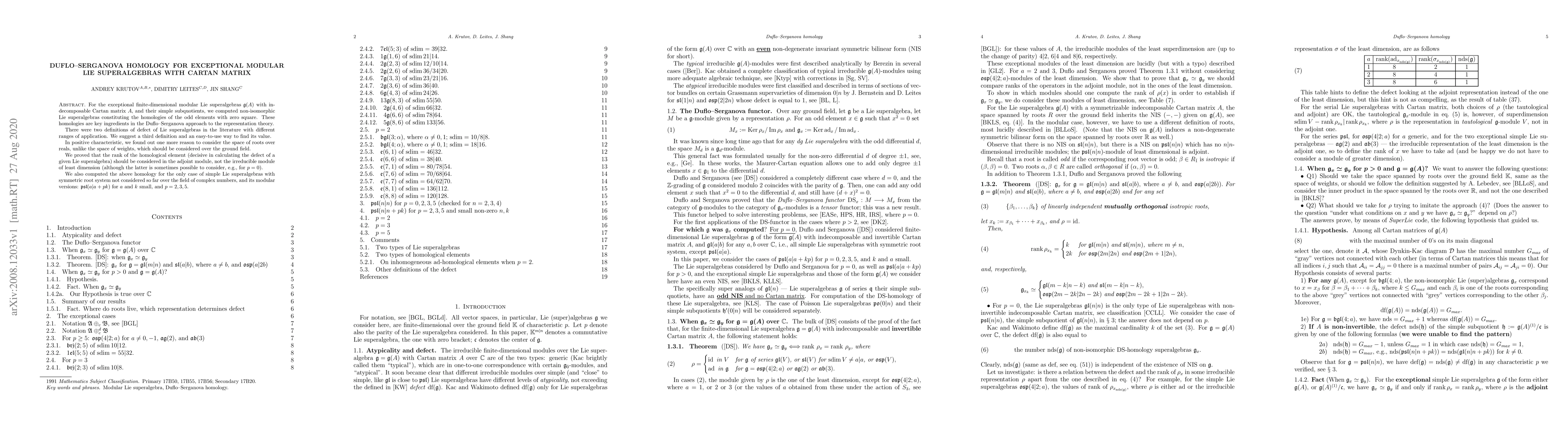 This paper computes the Duflo-Serganova homology for exceptional modular Lie superalgebras with indecomposable Cartan matrices, introducing a new definition for the defect of Lie superalgebras. It also highlights the importance of considering the space of roots over reals in positive characteristic and emphasizes the rank of homological elements in the adjoint module.