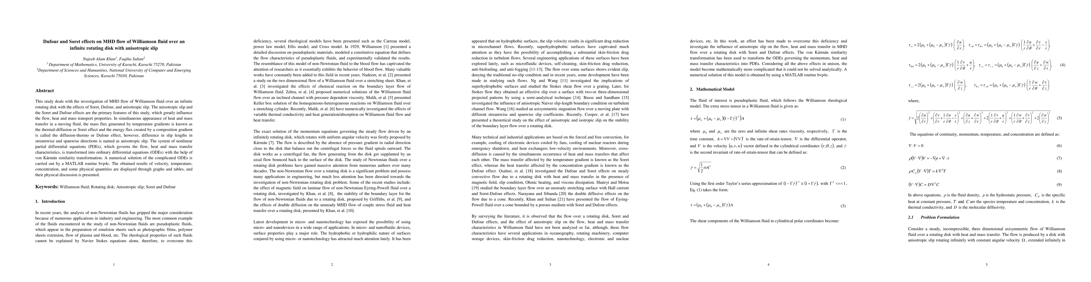 This study investigates the MHD flow of Williamson fluid over an infinite rotating disk, focusing on the effects of Soret, Dufour, and anisotropic slip. Numerical solutions reveal significant influences on flow, heat, and mass transport properties, analyzed via MATLAB and presented in graphs and tables.