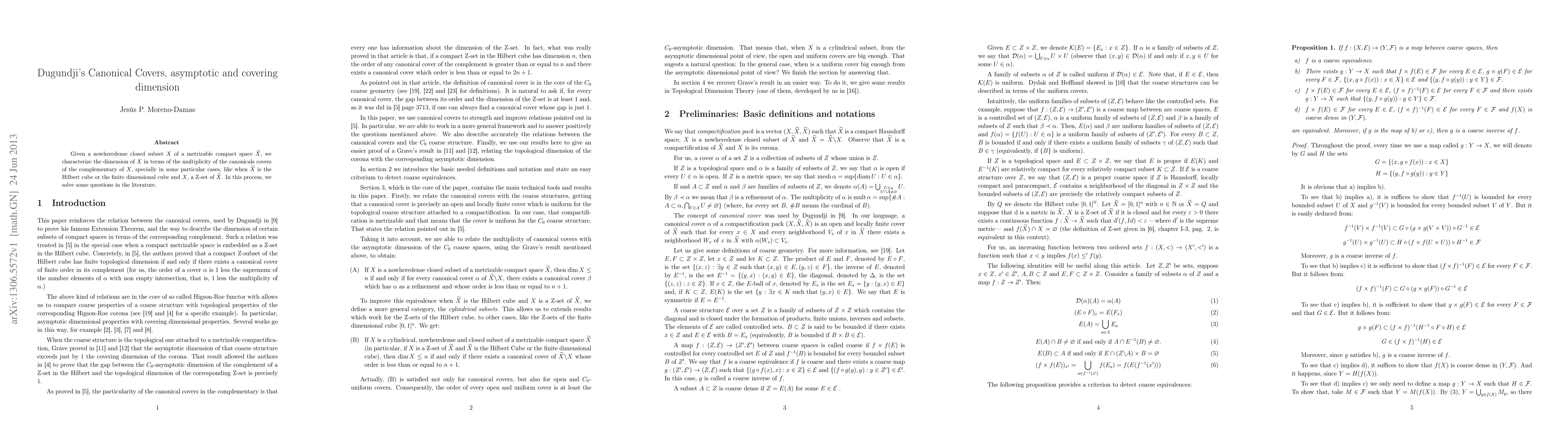 Given a nowheredense closed subset $X$ of a metrizable compact space $\tx$, we characterize the dimension of $X$ in terms of the multiplicity of the canonicals covers of the complementary of $X$, specially in some particular cases, like when $\tx$ is the Hilbert cube or the finite dimensional cube and $X$, a Z-set of $\tx$. In this process, we solve some questions in the literature.