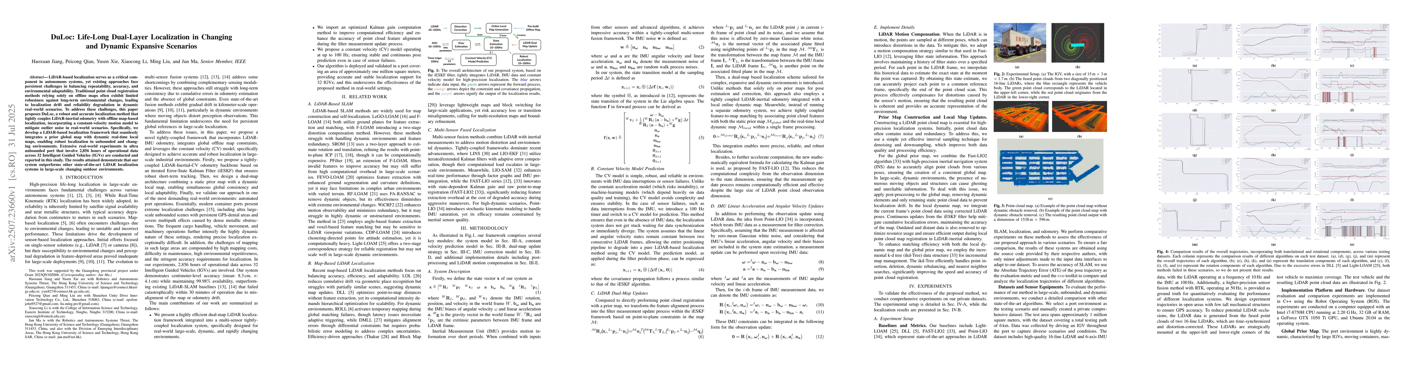LiDAR-based localization serves as a critical component in autonomous systems, yet existing approaches face persistent challenges in balancing repeatability, accuracy, and environmental adaptability. Traditional point cloud registration methods relying solely on offline maps often exhibit limited robustness against long-term environmental changes, leading to localization drift and reliability degradation in dynamic real-world scenarios. To address these challenges, this paper proposes DuLoc, a robust and accurate localization method that tightly couples LiDAR-inertial odometry with offline map-based localization, incorporating a constant-velocity motion model to mitigate outlier noise in real-world scenarios. Specifically, we develop a LiDAR-based localization framework that seamlessly integrates a prior global map with dynamic real-time local maps, enabling robust localization in unbounded and changing environments. Extensive real-world experiments in ultra unbounded port that involve 2,856 hours of operational data across 32 Intelligent Guided Vehicles (IGVs) are conducted and reported in this study. The results attained demonstrate that our system outperforms other state-of-the-art LiDAR localization systems in large-scale changing outdoor environments.