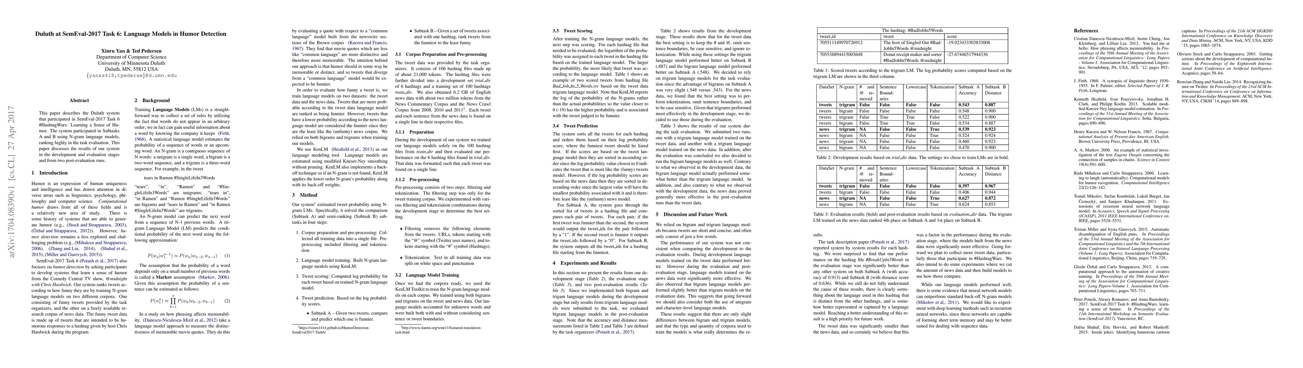 This paper describes the Duluth system that participated in SemEval-2017 Task 6 #HashtagWars: Learning a Sense of Humor. The system participated in Subtasks A and B using N-gram language models, ranking highly in the task evaluation. This paper discusses the results of our system in the development and evaluation stages and from two post-evaluation runs.