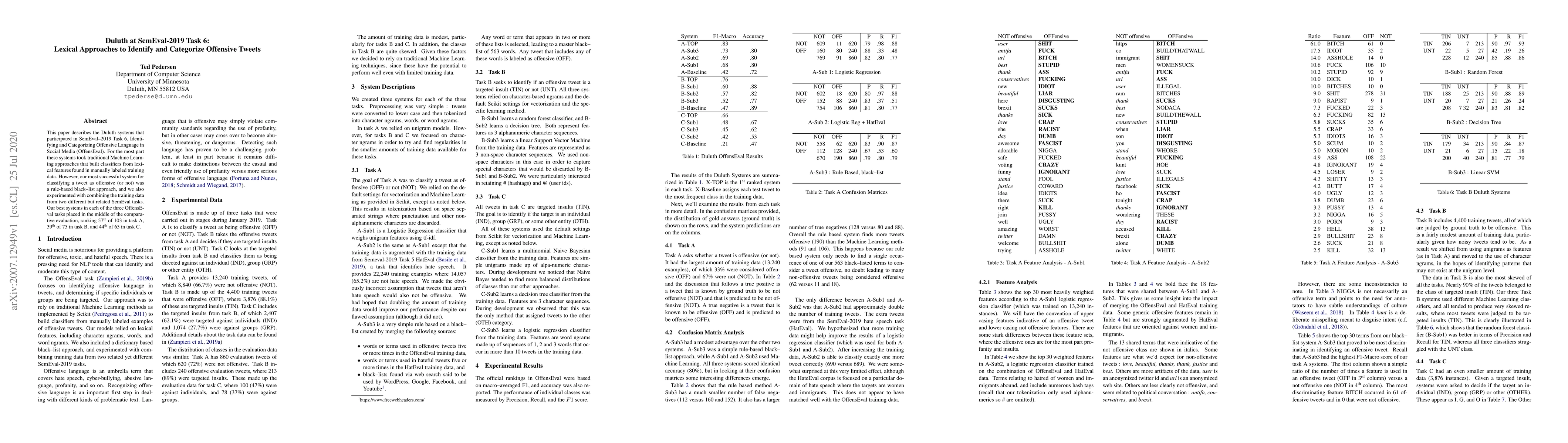 This paper describes the Duluth systems that participated in SemEval--2019 Task 6, Identifying and Categorizing Offensive Language in Social Media (OffensEval). For the most part these systems took traditional Machine Learning approaches that built classifiers from lexical features found in manually labeled training data. However, our most successful system for classifying a tweet as offensive (or not) was a rule-based black--list approach, and we also experimented with combining the training data from two different but related SemEval tasks. Our best systems in each of the three OffensEval tasks placed in the middle of the comparative evaluation, ranking 57th of 103 in task A, 39th of 75 in task B, and 44th of 65 in task C.
