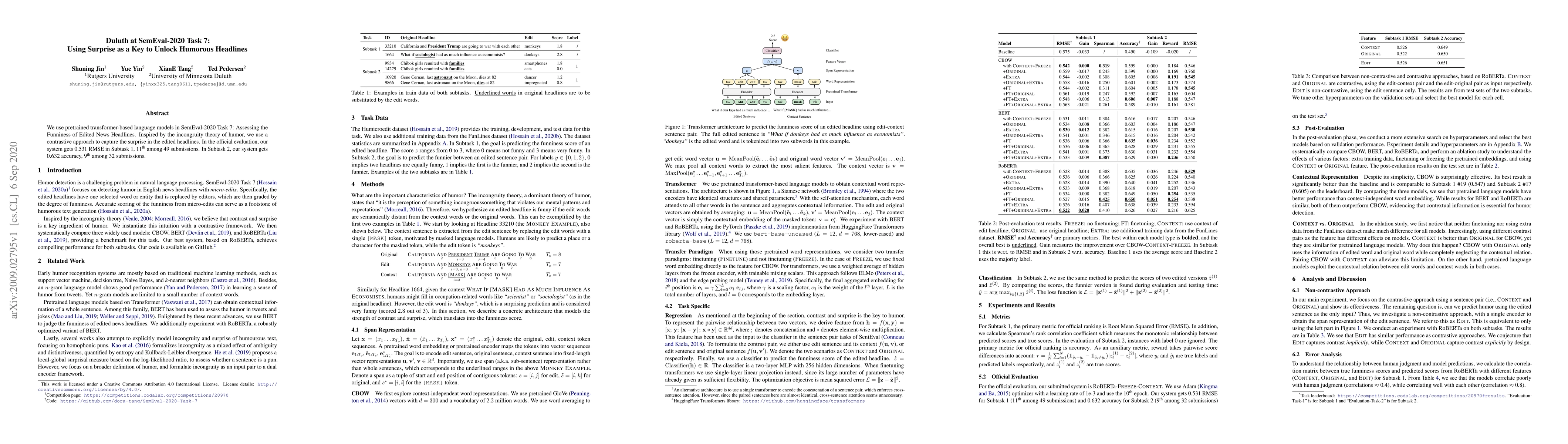 We use pretrained transformer-based language models in SemEval-2020 Task 7: Assessing the Funniness of Edited News Headlines. Inspired by the incongruity theory of humor, we use a contrastive approach to capture the surprise in the edited headlines. In the official evaluation, our system gets 0.531 RMSE in Subtask 1, 11th among 49 submissions. In Subtask 2, our system gets 0.632 accuracy, 9th among 32 submissions.
