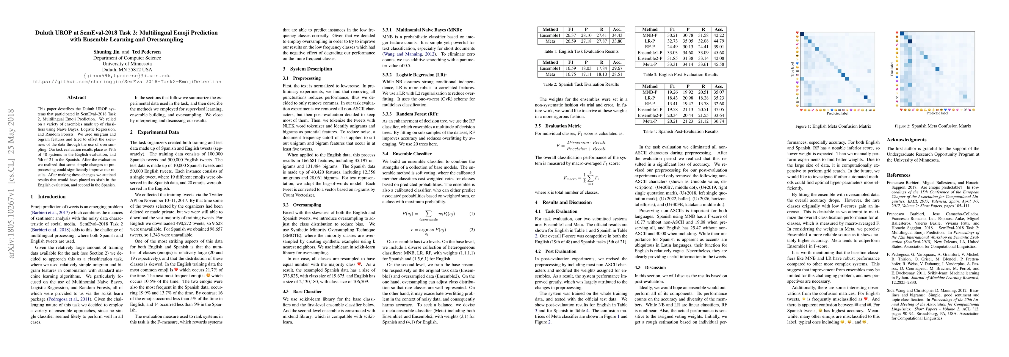 This paper describes the Duluth UROP systems that participated in SemEval--2018 Task 2, Multilingual Emoji Prediction. We relied on a variety of ensembles made up of classifiers using Naive Bayes, Logistic Regression, and Random Forests. We used unigram and bigram features and tried to offset the skewness of the data through the use of oversampling. Our task evaluation results place us 19th of 48 systems in the English evaluation, and 5th of 21 in the Spanish. After the evaluation we realized that some simple changes to preprocessing could significantly improve our results. After making these changes we attained results that would have placed us sixth in the English evaluation, and second in the Spanish.
