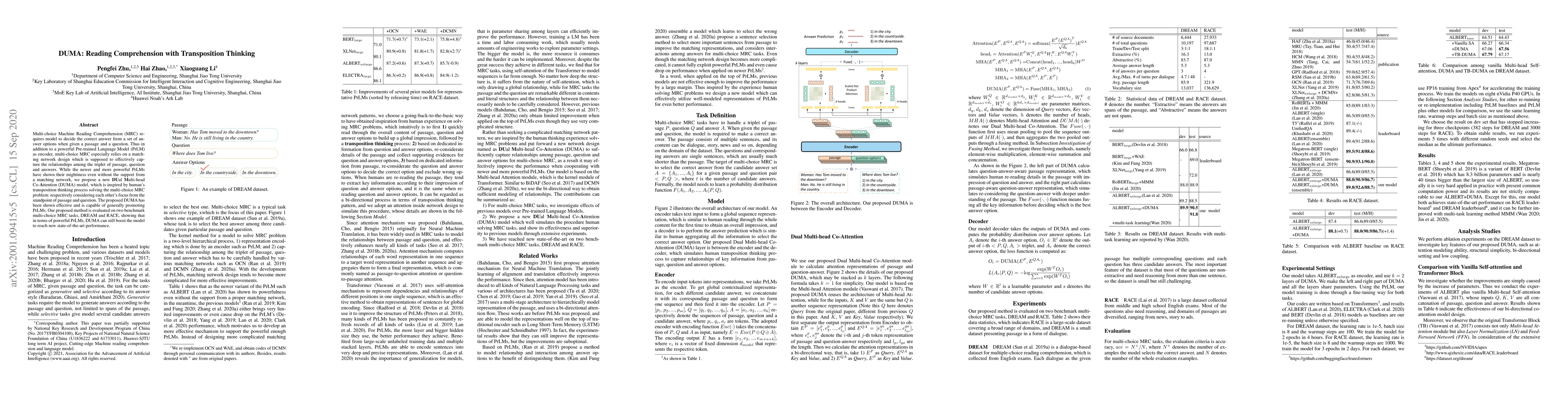 The paper proposes DUMA, a DUal Multi-head Co-Attention model inspired by human transposition thinking, to enhance multi-choice Machine Reading Comprehension. It demonstrates DUMA's effectiveness in improving state-of-the-art performance on DREAM and RACE benchmarks.
