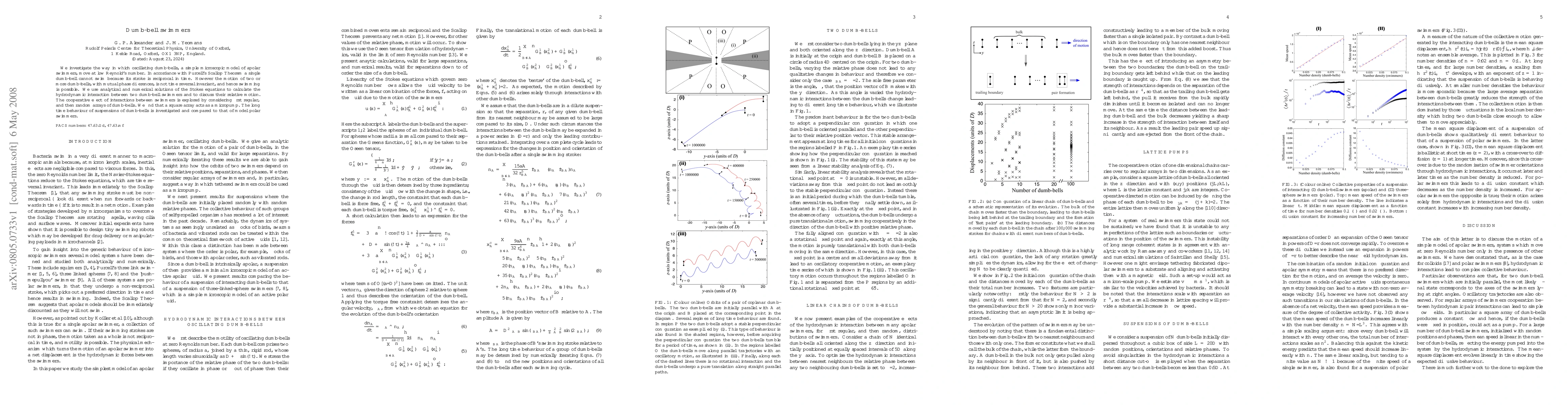 This paper explores the movement of oscillating dumb-bells, a model for apolar swimmers, at low Reynolds number, demonstrating that while individual dumb-bells cannot swim due to time-reversal symmetry, multiple dumb-bells with phase differences can. The study uses analytical and numerical methods to analyze the hydrodynamic interactions and cooperative effects in arrays of dumb-bells, finding that a square array acts as a micropump.