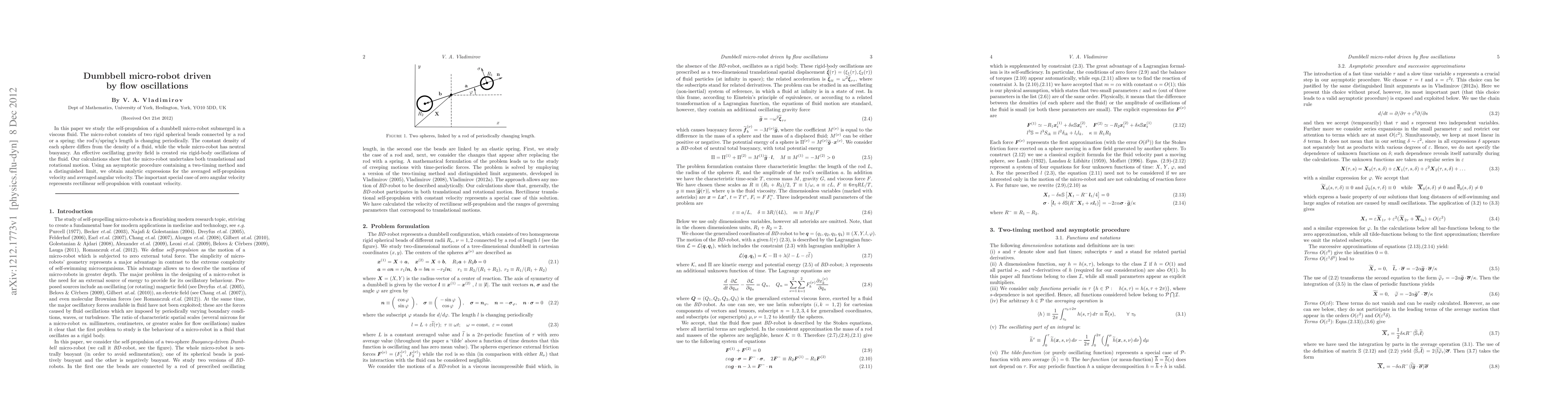 In this paper we study the self-propulsion of a dumbbell micro-robot submerged in a viscous fluid. The micro-robot consists of two rigid spherical beads connected by a rod or a spring; the rod's/spring's length is changing periodically. The constant density of each sphere differs from the density of a fluid, while the whole micro-robot has neutral buoyancy. An effective oscillating gravity field is created via rigid-body oscillations of the fluid. Our calculations show that the micro-robot undertakes both translational and rotational motion. Using an asymptotic procedure containing a two-timing method and a distinguished limit, we obtain analytic expressions for the averaged self-propulsion velocity and averaged angular velocity. The important special case of zero angular velocity represents rectilinear self-propulsion with constant velocity.