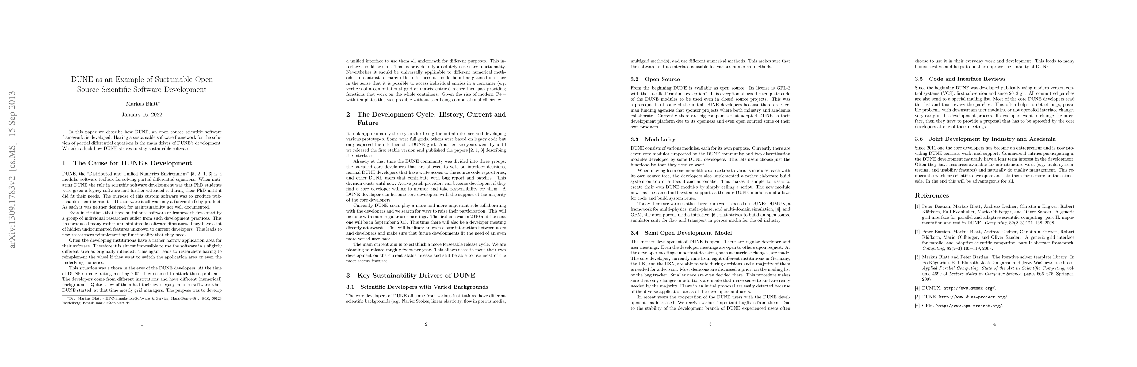 Summary: This paper explores the sustainable development of DUNE, an open source scientific software framework for solving partial differential equations, emphasizing its strategies to maintain long-term sustainability and adaptability.