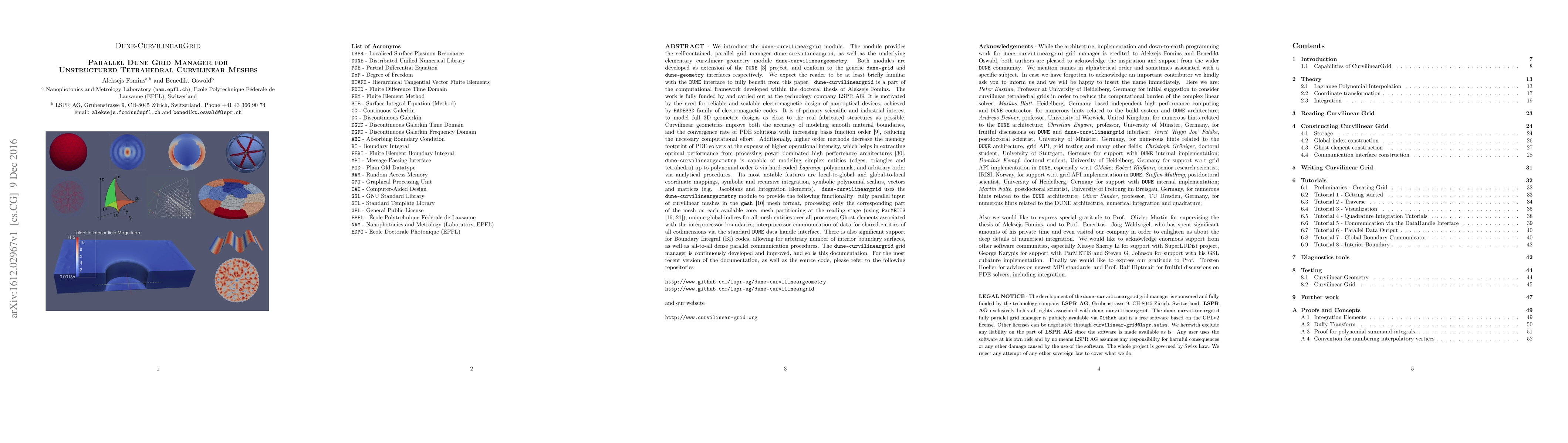 The dune-curvilineargrid module offers a parallel grid manager for scalable, unstructured tetrahedral meshes, enhancing electromagnetic design for nanooptical devices. It features advanced capabilities for finite element and boundary integral methods, utilizing MPI and ParMETIS for parallelization and grid partitioning.