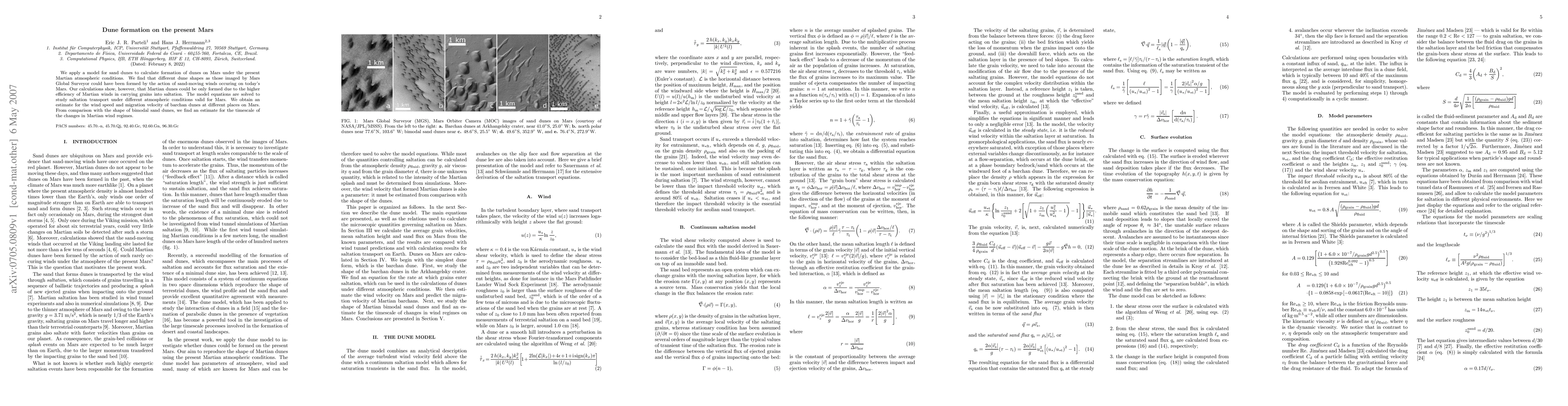 This research models the formation of sand dunes on Mars under current atmospheric conditions, demonstrating that Martian dunes are shaped by today's sand-moving winds and that higher wind efficiency facilitates dune formation. The study estimates the wind speed and dune migration velocity, and provides a timescale for changes in Martian wind regimes based on dune shape comparisons.