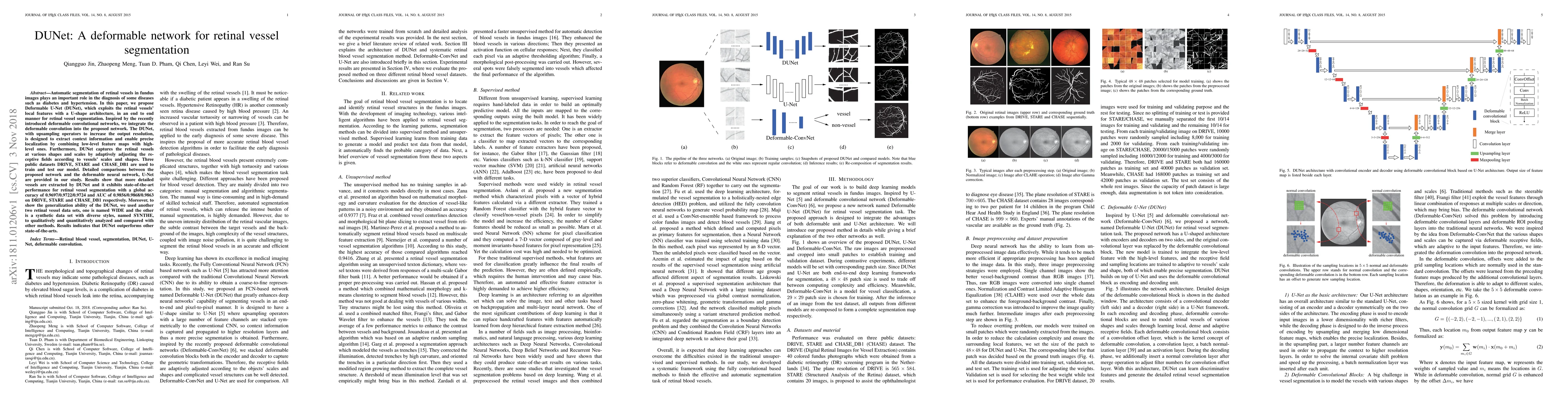 The DUNet, a deformable U-Net architecture, integrates deformable convolutions to segment retinal vessels in fundus images, achieving state-of-the-art performance with high accuracy and AUC on multiple datasets, demonstrating superior vessel extraction and generalization.