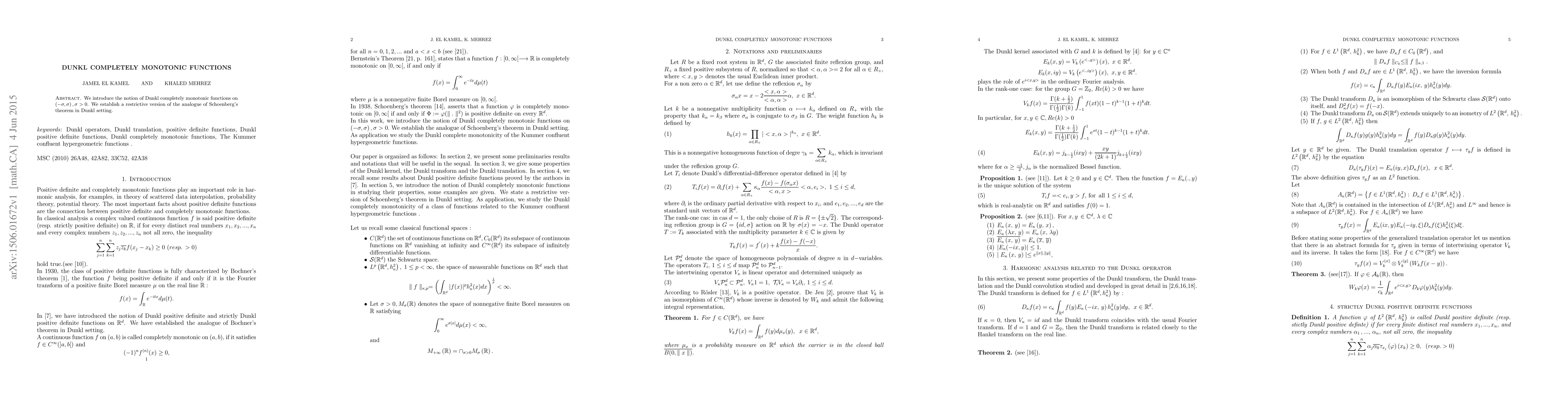 We introduce the notion of Dunkl completely monotonic functions on $\left(-\sigma,\sigma\right), \sigma>0$. We establish a restrictive version of the analogue of Schoenberg's theorem in Dunkl setting.