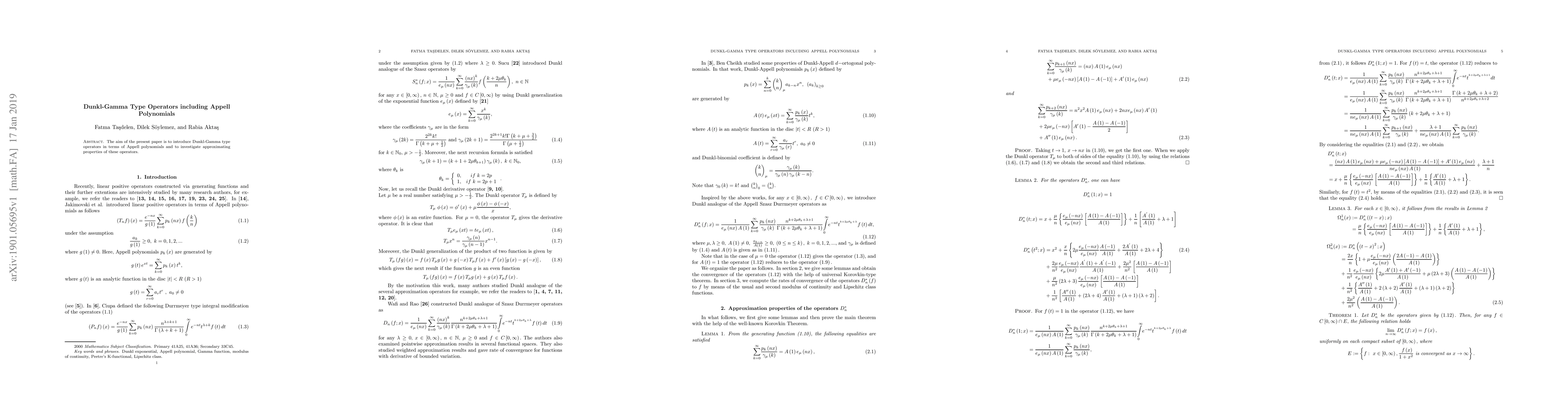 The aim of the present paper is to introduce Dunkl-Gamma type operators in terms of Appell polynomials and to investigate approximating properties of these operators.