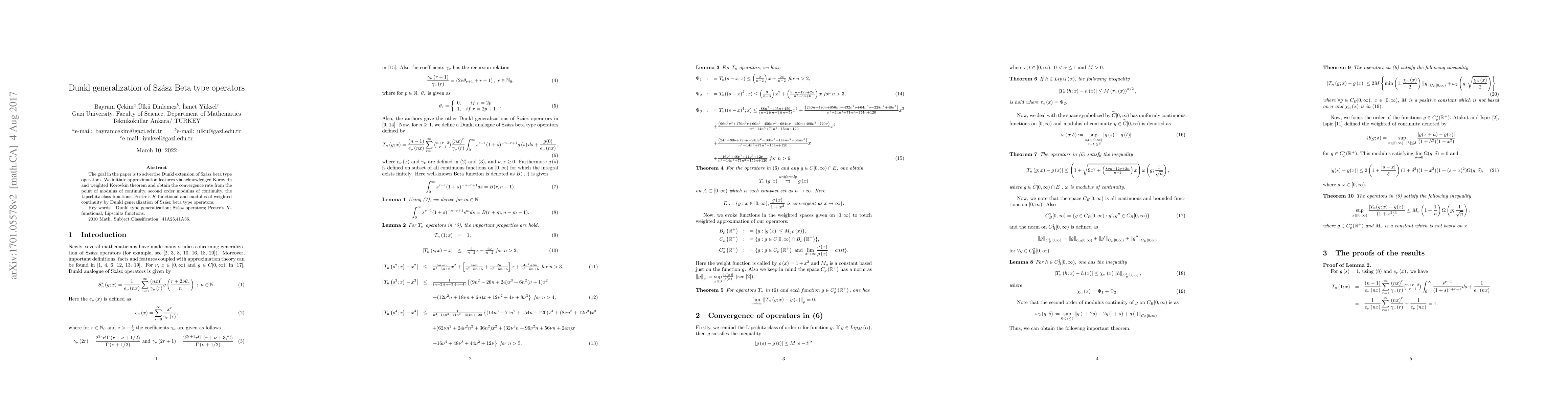 This paper introduces Dunkl generalizations of Szasz Beta type operators and explores their approximation properties, utilizing Korovkin and weighted Korovkin theorems to establish convergence rates based on various continuity measures and functional classes.
