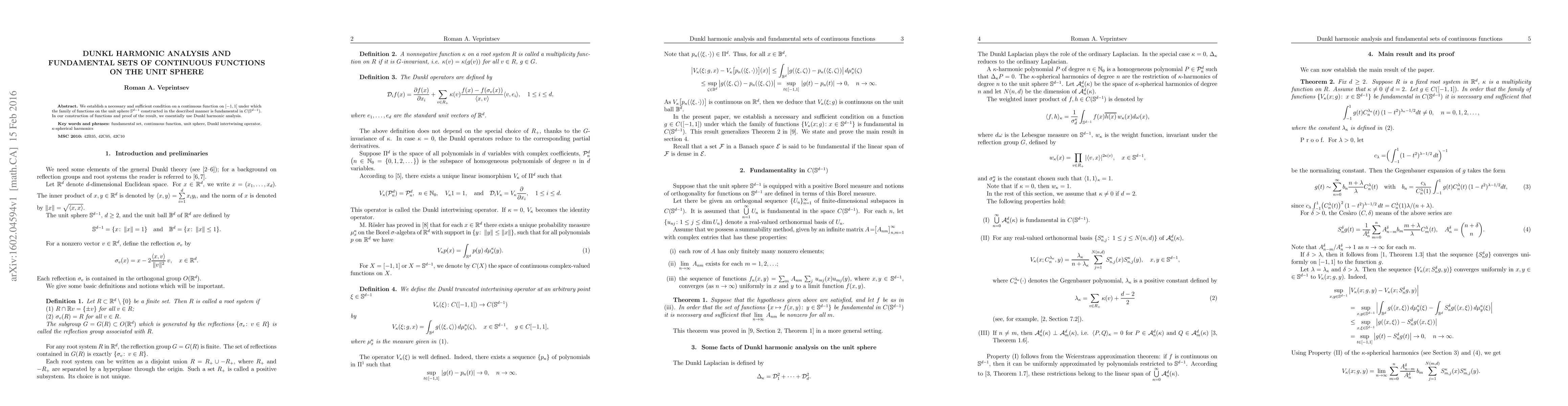 We establish a necessary and sufficient condition on a continuous function on $[-1,1]$ under which the family of functions on the unit sphere $\mathbb{S}^{d-1}$ constructed in the described manner is fundamental in $C(\mathbb{S}^{d-1})$. In our construction of functions and proof of the result, we essentially use Dunkl harmonic analysis.