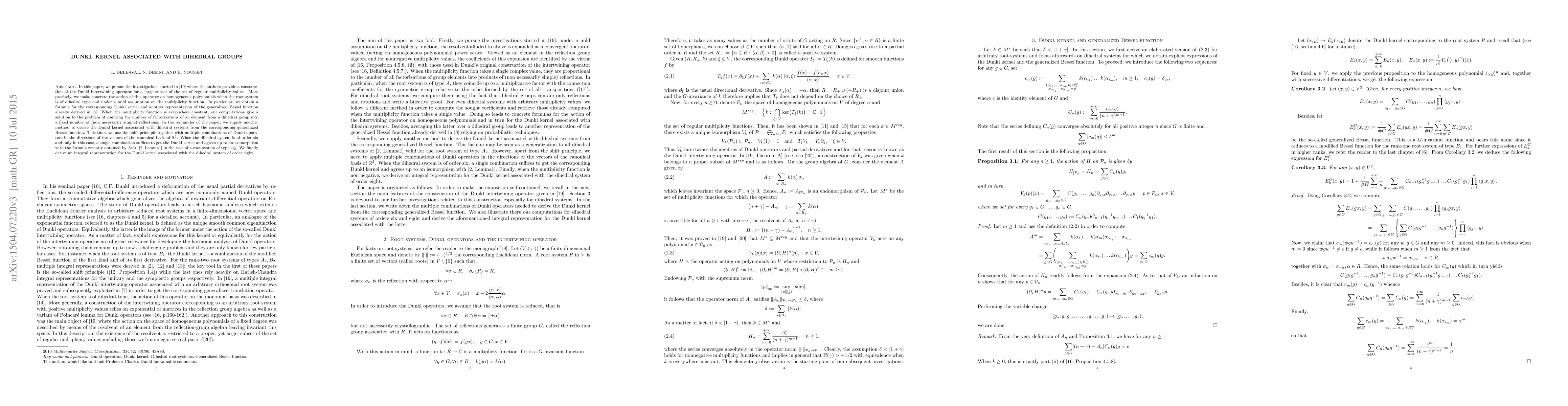 This paper explores the Dunkl intertwining operator's action on homogeneous polynomials for dihedral root systems, providing a formula for the Dunkl kernel and another representation of the generalized Bessel function. It also offers an alternative method for deriving the Dunkl kernel using the shift principle and multiple combinations of Dunkl operators, concluding with an integral representation for the kernel in the dihedral system of order eight.