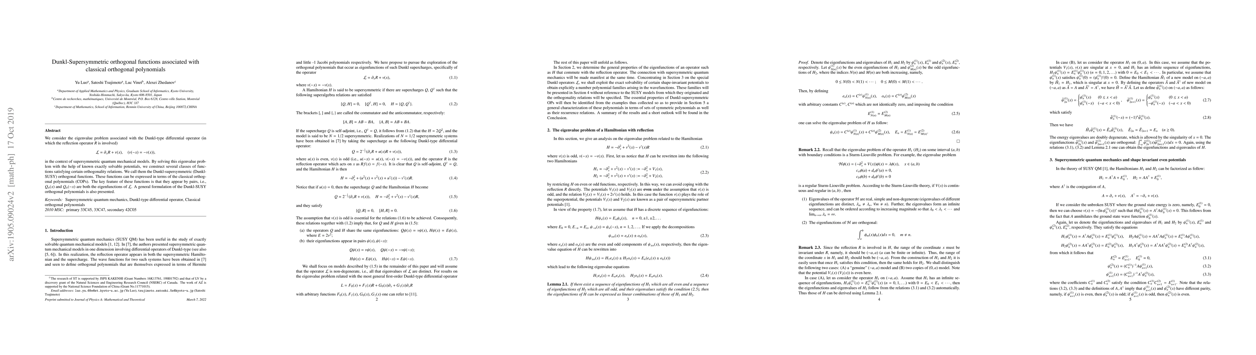 We consider the eigenvalue problem associated with the Dunkl-type differential operator (in which the reflection operator R is involved) L = dx R + v(x), (v(-x) = -v(x)), in the context of supersymmetric quantum mechanical models. By solving this eigenvalue problem with the help of known exactly solvable potentials, we construct several classes of functions satisfying certain orthogonality relations. We call them the Dunkl-supersymmetric (Dunkl-SUSY) orthogonal functions. These functions can be expressed in terms of the classical orthogonal polynomials (COPs). The key feature of these functions is that they appear by pairs, i.e., Qn(x) and Qn(-x) are both the eigenfunctions of L. A general formulation of the Dunkl-SUSY orthogonal polynomials is also presented.