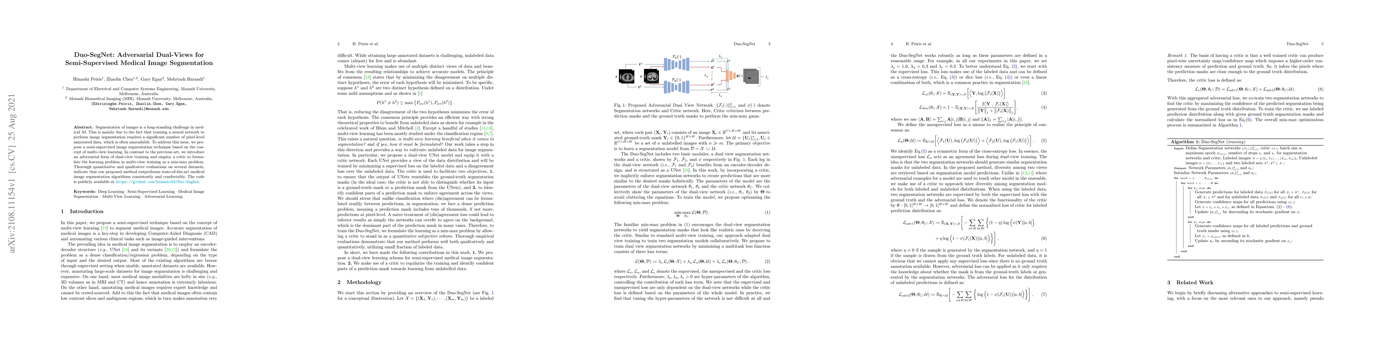 Segmentation of images is a long-standing challenge in medical AI. This is mainly due to the fact that training a neural network to perform image segmentation requires a significant number of pixel-level annotated data, which is often unavailable. To address this issue, we propose a semi-supervised image segmentation technique based on the concept of multi-view learning. In contrast to the previous art, we introduce an adversarial form of dual-view training and employ a critic to formulate the learning problem in multi-view training as a min-max problem. Thorough quantitative and qualitative evaluations on several datasets indicate that our proposed method outperforms state-of-the-art medical image segmentation algorithms consistently and comfortably. The code is publicly available at https://github.com/himashi92/Duo-SegNet