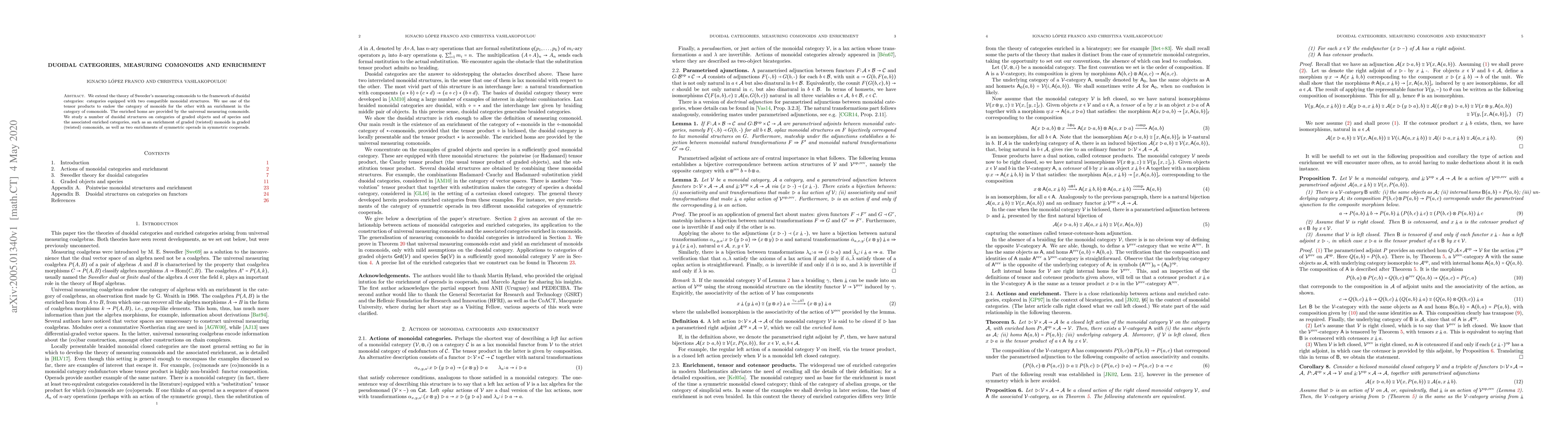 This paper extends the theory of measuring comonoids to duoidal categories, using one monoidal structure to enrich the category of monoids for the other in comonoids, focusing on applications to graded objects, species, and operads. It explores specific duoidal structures and their enriched categories.