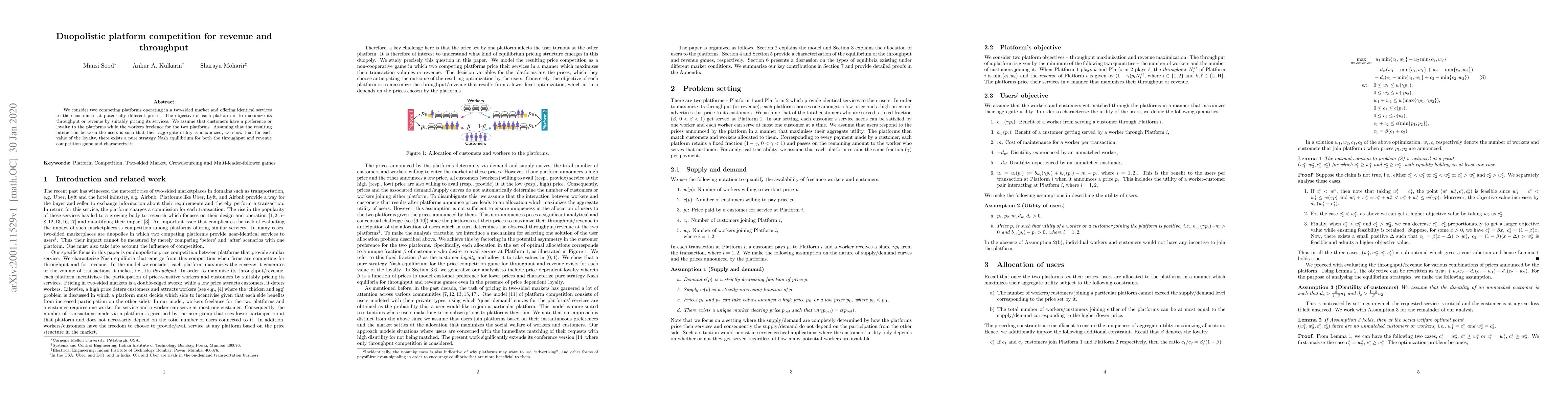We consider two competing platforms operating in a two-sided market and offering identical services to their customers at potentially different prices. The objective of each platform is to maximize its throughput or revenue by suitably pricing its services. We assume that customers have a preference or loyalty to the platforms while the workers freelance for the two platforms. Assuming that the resulting interaction between the users is such that their aggregate utility is maximized, we show that for each value of the loyalty, there exists a pure strategy Nash equilibrium for both the throughput and revenue competition game and characterize it.