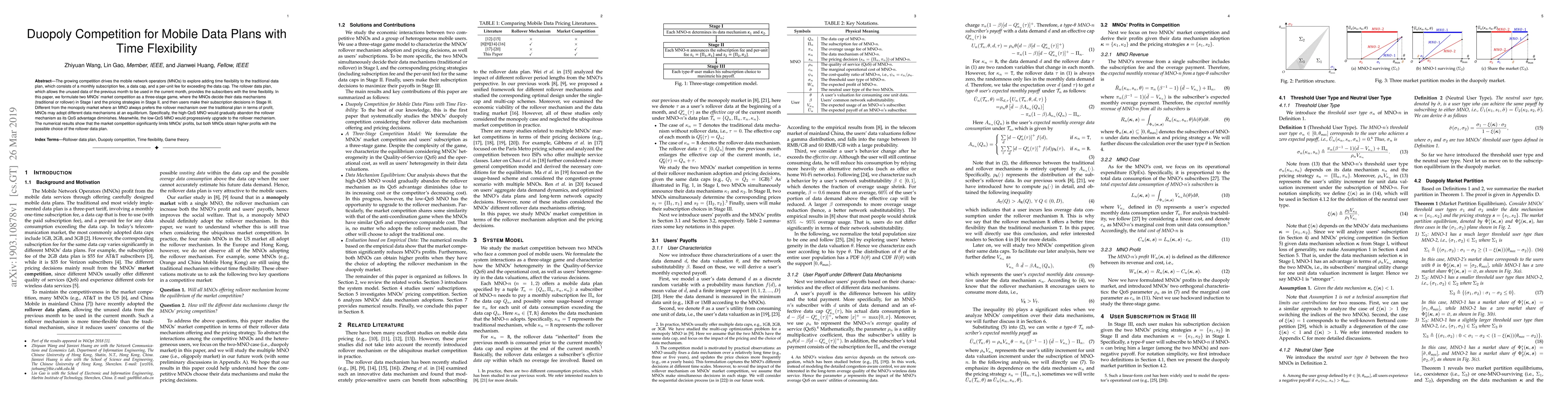 The growing competition drives the mobile network operators (MNOs) to explore adding time flexibility to the traditional data plan, which consists of a monthly subscription fee, a data cap, and a per-unit fee for exceeding the data cap. The rollover data plan, which allows the unused data of the previous month to be used in the current month, provides the subscribers with the time flexibility. In this paper, we formulate two MNOs' market competition as a three-stage game, where the MNOs decide their data mechanisms (traditional or rollover) in Stage I and the pricing strategies in Stage II, and then users make their subscription decisions in Stage III. Different from the monopoly market where an MNO always prefers the rollover mechanism over the traditional plan in terms of profit, MNOs may adopt different data mechanisms at an equilibrium. Specifically, the high-QoS MNO would gradually abandon the rollover mechanism as its QoS advantage diminishes. Meanwhile, the low-QoS MNO would progressively upgrade to the rollover mechanism. The numerical results show that the market competition significantly limits MNOs' profits, but both MNOs obtain higher profits with the possible choice of the rollover data plan.