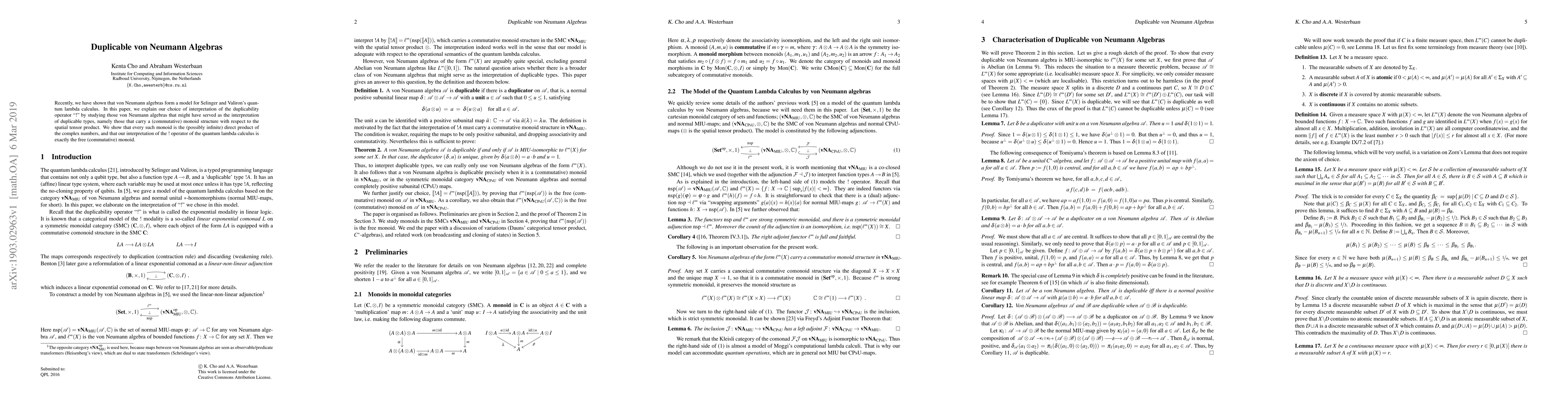 This paper explores von Neumann algebras that support a commutative monoid structure under the spatial tensor product, interpreting duplicable types in quantum lambda calculus. It concludes that such algebras are direct products of the complex numbers, and the duplicability operator "!" corresponds to the free commutative monoid.