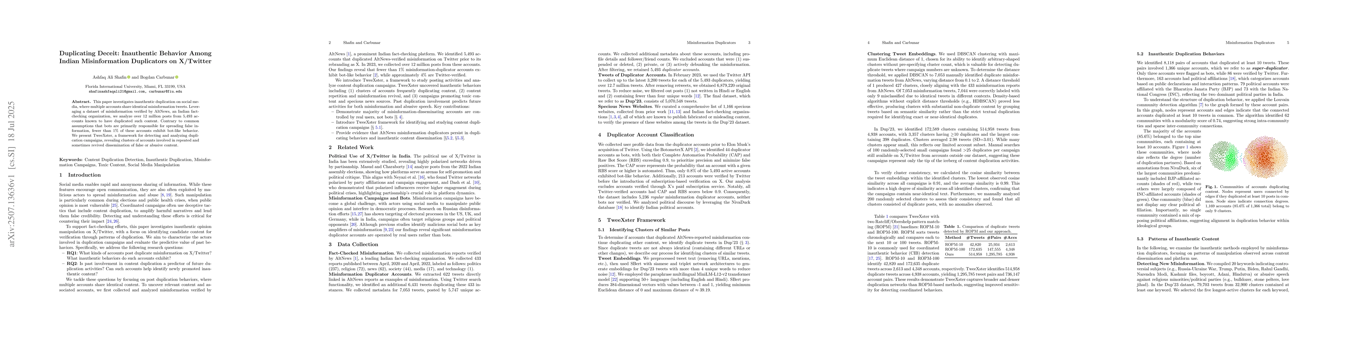 This paper investigates inauthentic duplication on social media, where multiple accounts share identical misinformation tweets. Leveraging a dataset of misinformation verified by AltNews, an Indian fact-checking organization, we analyze over 12 million posts from 5,493 accounts known to have duplicated such content. Contrary to common assumptions that bots are primarily responsible for spreading false information, fewer than 1\% of these accounts exhibit bot-like behavior. We present TweeXster, a framework for detecting and analyzing duplication campaigns, revealing clusters of accounts involved in repeated and sometimes revived dissemination of false or abusive content.