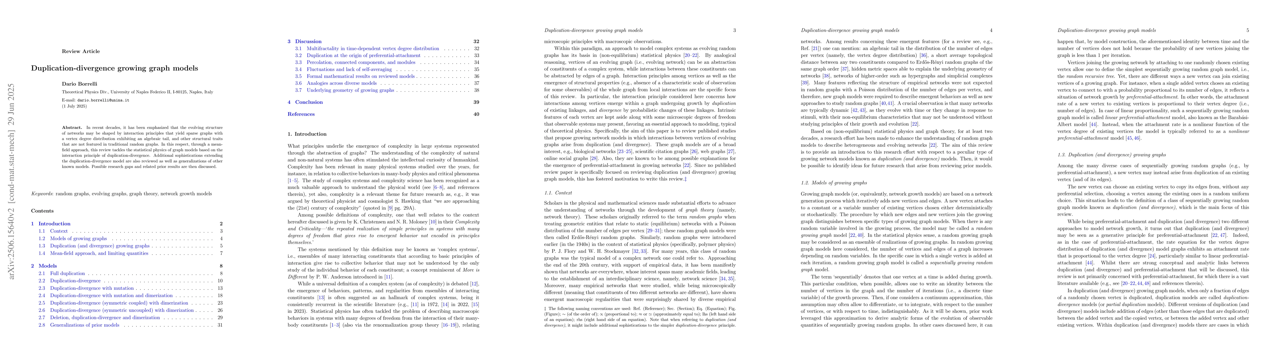 In recent decades, it has been emphasized that the evolving structure of networks may be shaped by interaction principles that yield sparse graphs with a vertex degree distribution exhibiting an algebraic tail, and other structural traits that are not featured in traditional random graphs. In this respect, through a mean-field approach, this review tackles the statistical physics of graph models based on the interaction principle of duplication-divergence. Additional sophistications extending the duplication-divergence model are also reviewed as well as generalizations of other known models. Possible research gaps and related prior results are then discussed.