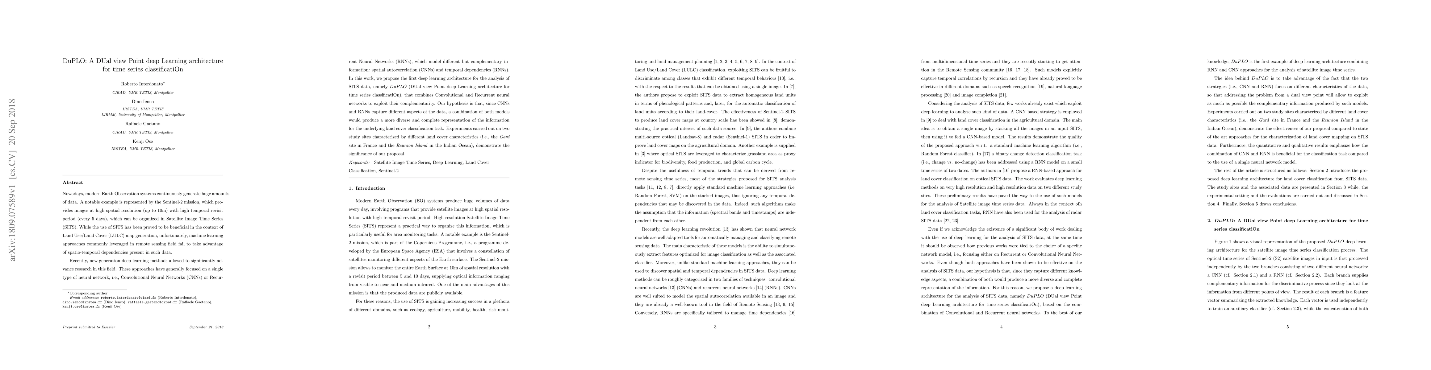 Nowadays, modern Earth Observation systems continuously generate huge amounts of data. A notable example is represented by the Sentinel-2 mission, which provides images at high spatial resolution (up to 10m) with high temporal revisit period (every 5 days), which can be organized in Satellite Image Time Series (SITS). While the use of SITS has been proved to be beneficial in the context of Land Use/Land Cover (LULC) map generation, unfortunately, machine learning approaches commonly leveraged in remote sensing field fail to take advantage of spatio-temporal dependencies present in such data. Recently, new generation deep learning methods allowed to significantly advance research in this field. These approaches have generally focused on a single type of neural network, i.e., Convolutional Neural Networks (CNNs) or Recurrent Neural Networks (RNNs), which model different but complementary information: spatial autocorrelation (CNNs) and temporal dependencies (RNNs). In this work, we propose the first deep learning architecture for the analysis of SITS data, namely \method{} (DUal view Point deep Learning architecture for time series classificatiOn), that combines Convolutional and Recurrent neural networks to exploit their complementarity. Our hypothesis is that, since CNNs and RNNs capture different aspects of the data, a combination of both models would produce a more diverse and complete representation of the information for the underlying land cover classification task. Experiments carried out on two study sites characterized by different land cover characteristics (i.e., the \textit{Gard} site in France and the \textit{Reunion Island} in the Indian Ocean), demonstrate the significance of our proposal.