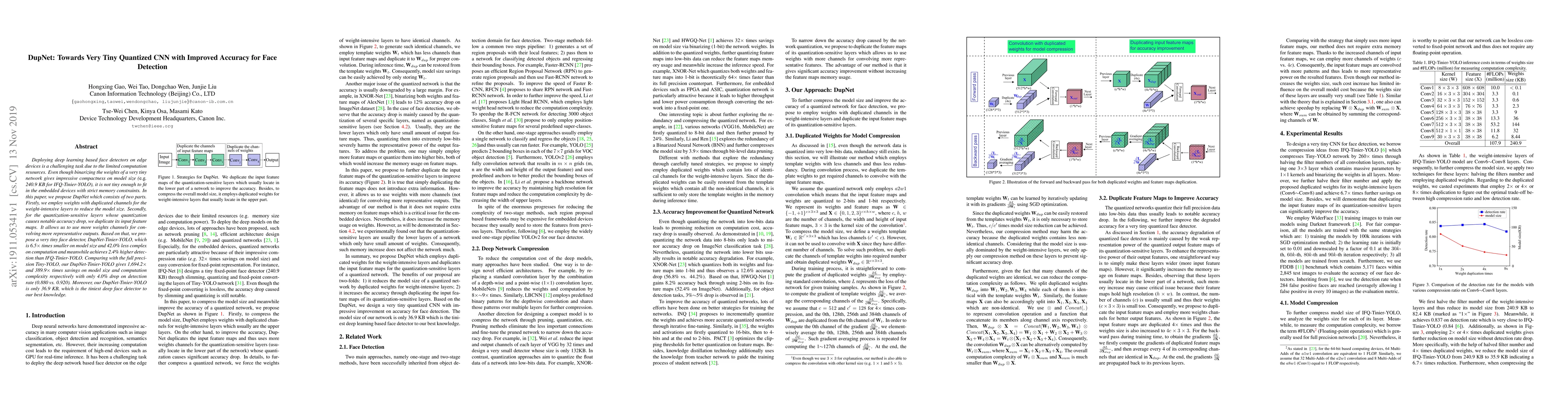 DupNet proposes a very tiny quantized CNN for face detection that employs duplicated channels and feature maps to significantly reduce model size and computational complexity while maintaining high accuracy. DupNet-Tinier-YOLO achieves a 6.5X reduction in size and 42.0% in complexity compared to IFQ-Tinier-YOLO, with only a 4.0% drop in detection rate.