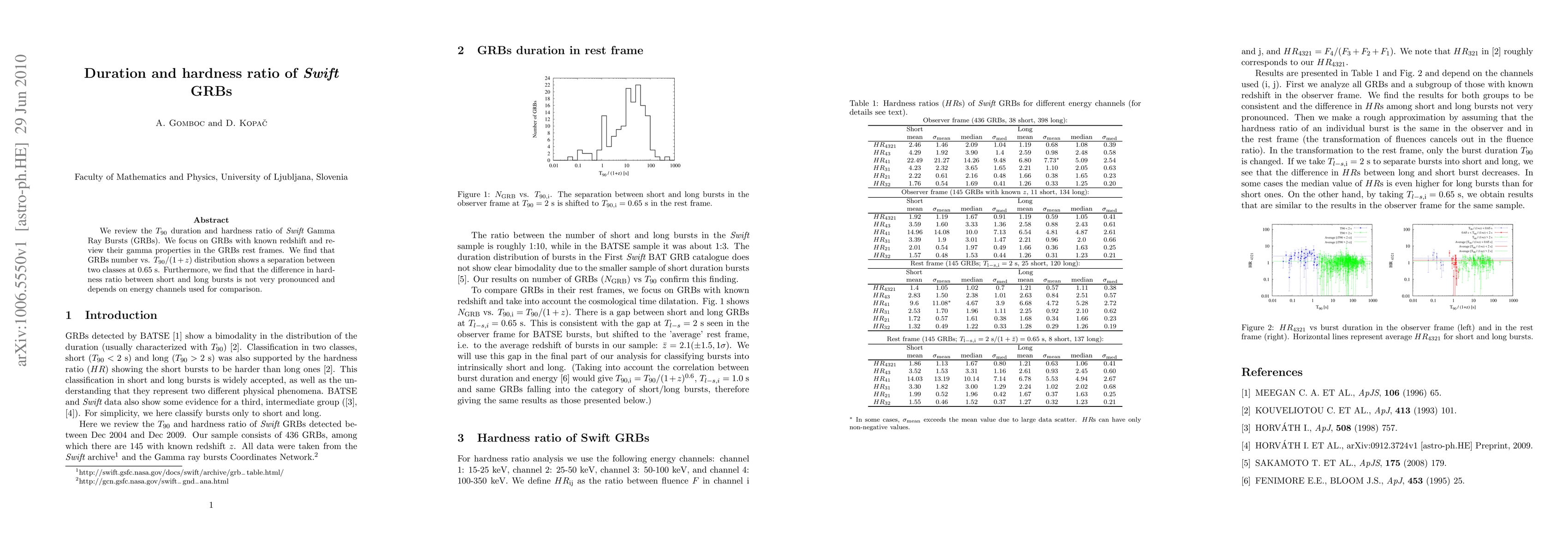This paper reviews the T_90 duration and hardness ratio of Swift Gamma Ray Bursts (GRBs), finding a separation in GRBs' number vs. T_90/(1+z) distribution at 0.65 s, while noting the hardness ratio difference between short and long bursts is not significant and varies with energy channels.