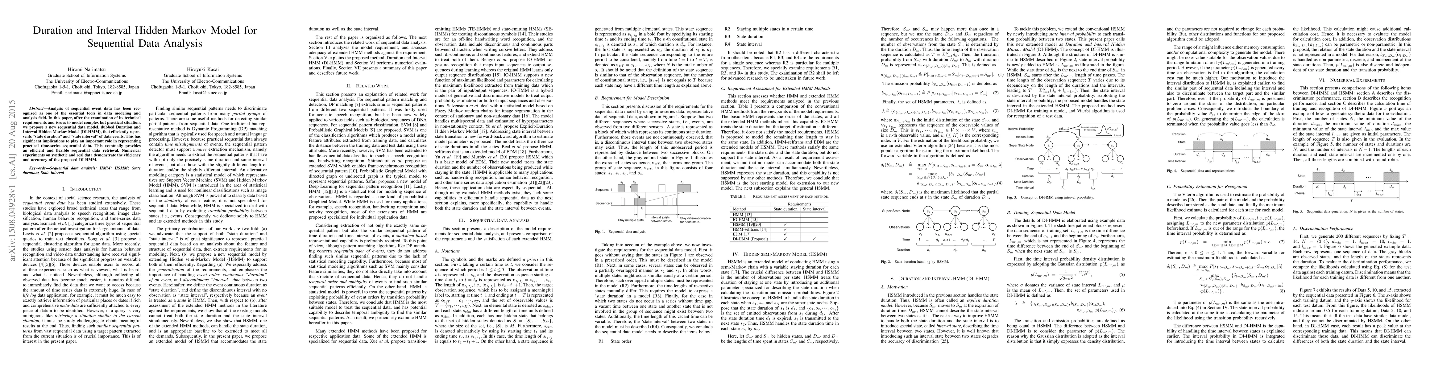Analysis of sequential event data has been recognized as one of the essential tools in data modeling and analysis field. In this paper, after the examination of its technical requirements and issues to model complex but practical situation, we propose a new sequential data model, dubbed Duration and Interval Hidden Markov Model (DI-HMM), that efficiently represents "state duration" and "state interval" of data events. This has significant implications to play an important role in representing practical time-series sequential data. This eventually provides an efficient and flexible sequential data retrieval. Numerical experiments on synthetic and real data demonstrate the efficiency and accuracy of the proposed DI-HMM.
