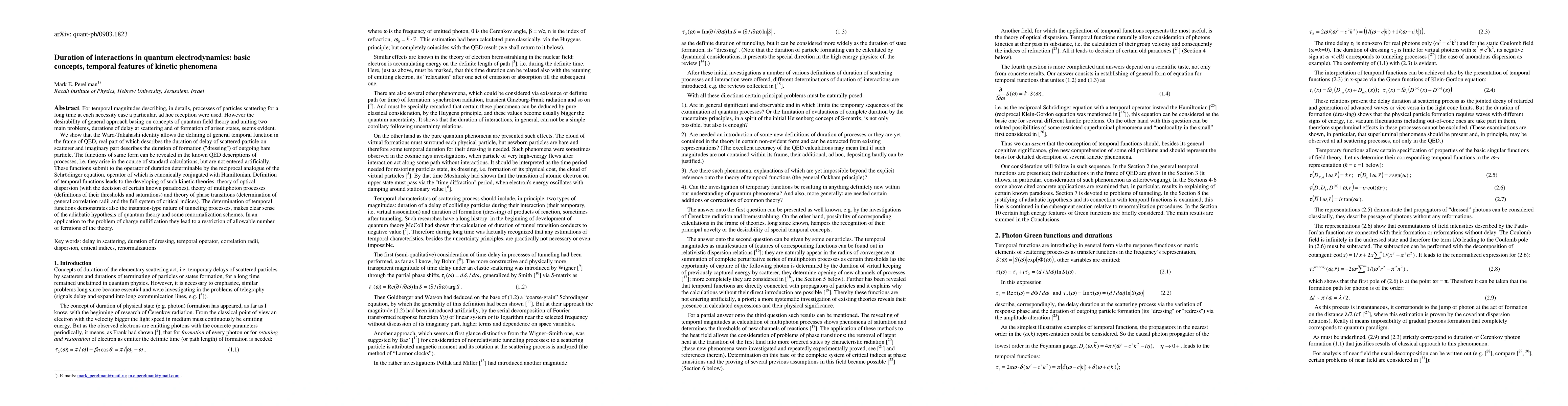 For temporal magnitudes describing, in details, processes of particles scattering for a long time at each necessity case a particular, ad hoc reception were used. However the desirability of general approach basing on concepts of quantum field theory and uniting two main problems, durations of delay at scattering and of formation of arisen states, seems evident. We show that the Ward-Takahashi identity allows the defining of general temporal function in the frame of QED, real part of which describes the duration of delay of scattered particle on scatterer and imaginary part describes the duration of formation ("dressing") of outgoing bare particle. The functions of same form can be revealed in the known QED descriptions of processes, i.e. they arise in the course of standard calculations, but are not entered artificially. These functions submit to the operator of duration determinable by the reciprocal analogue of the Schroedinger equation, operator of which is canonically conjugated with Hamiltonian. Definition of temporal functions leads to the developing of such kinetic theories: theory of optical dispersion (with the decision of certain known paradoxes), theory of multiphoton processes (definitions of their thresholds and saturations) and theory of phase transitions (determination of general correlation radii and the full system of critical indices). The determination of temporal functions demonstrates also the instanton-type nature of tunneling processes, makes clear sense of the adiabatic hypothesis of quantum theory and some renormalization schemes. In an application to the problem of charge nullification they lead to a restriction of allowable number of fermions of the theory.