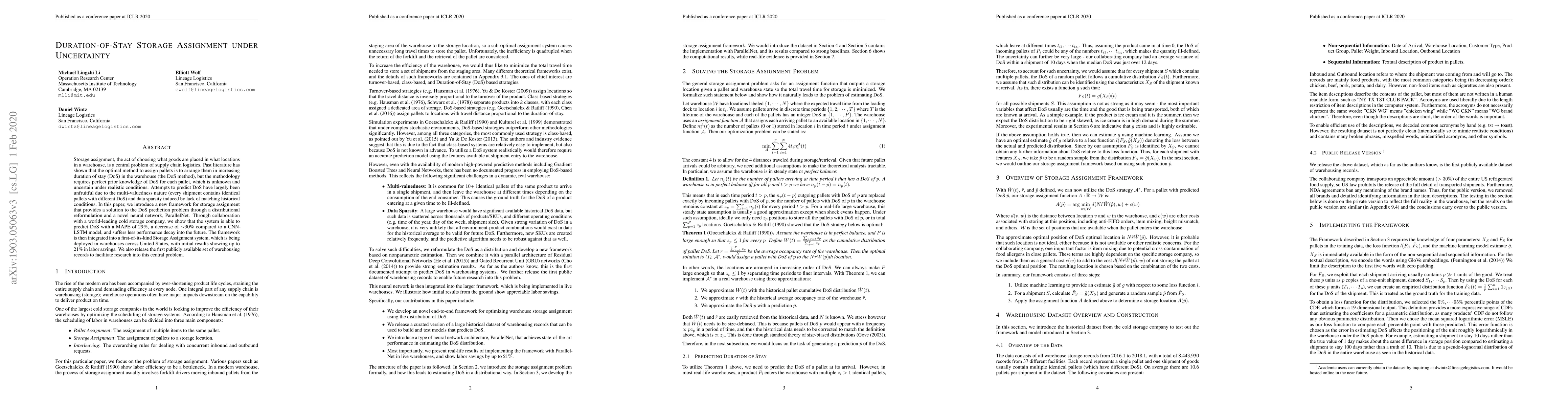 Optimizing storage assignment is a central problem in warehousing. Past literature has shown the superiority of the Duration-of-Stay (DoS) method in assigning pallets, but the methodology requires perfect prior knowledge of DoS for each pallet, which is unknown and uncertain under realistic conditions. The dynamic nature of a warehouse further complicates the validity of synthetic data testing that is often conducted for algorithms. In this paper, in collaboration with a large cold storage company, we release the first publicly available set of warehousing records to facilitate research into this central problem. We introduce a new framework for storage assignment that accounts for uncertainty in warehouses. Then, by utilizing a combination of convolutional and recurrent neural network models, ParallelNet, we show that it is able to predict future shipments well: it achieves up to 29% decrease in MAPE compared to CNN-LSTM on unseen future shipments, and suffers less performance decay over time. The framework is then integrated into a first-of-its-kind Storage Assignment system, which is being piloted in warehouses across the country, with initial results showing up to 19% in labor savings.