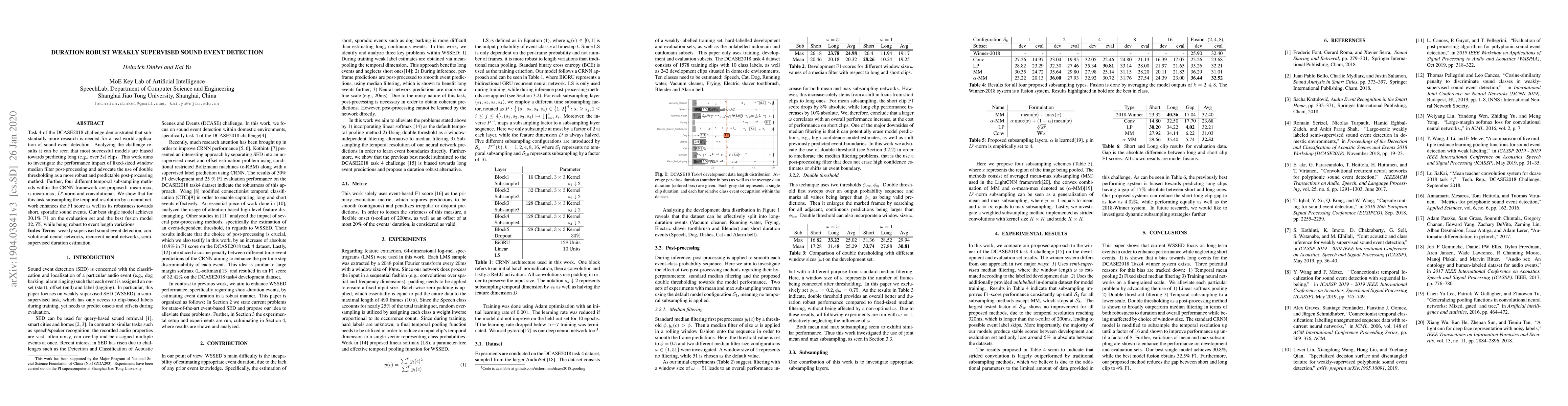 Task 4 of the DCASE2018 challenge demonstrated that substantially more research is needed for a real-world application of sound event detection. Analyzing the challenge results it can be seen that most successful models are biased towards predicting long (e.g., over 5s) clips. This work aims to investigate the performance impact of fixed-sized window median filter post-processing and advocate the use of double thresholding as a more robust and predictable post-processing method. Further, four different temporal subsampling methods within the CRNN framework are proposed: mean-max, alpha-mean-max, Lp-norm and convolutional. We show that for this task subsampling the temporal resolution by a neural network enhances the F1 score as well as its robustness towards short, sporadic sound events. Our best single model achieves 30.1% F1 on the evaluation set and the best fusion model 32.5%, while being robust to event length variations.