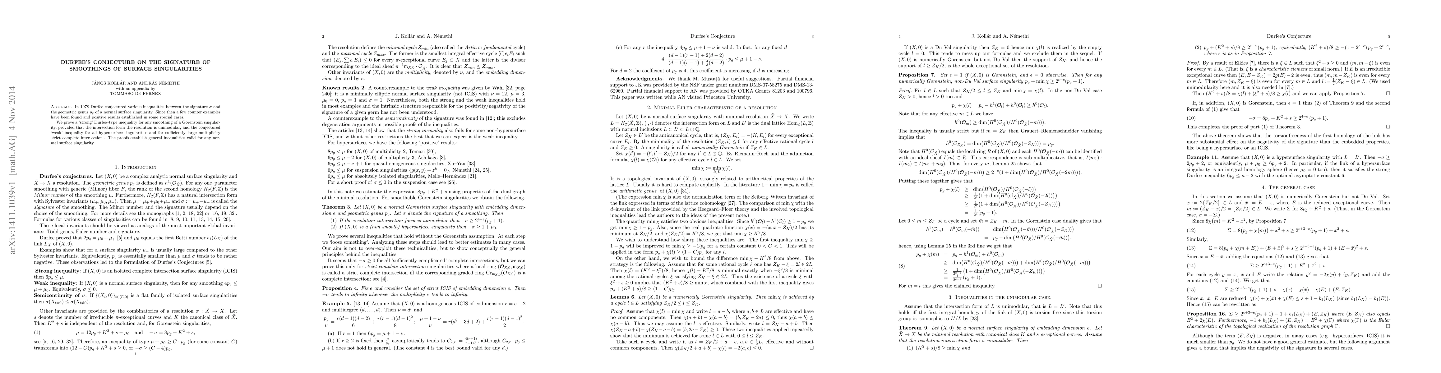 In 1978 Durfee conjectured various inequalities between the signature and the geometric genus of a normal surface singularity. Since then a few counter examples have been found and positive results established in some special cases. We prove a `strong' Durfee--type inequality for any smoothing of a Gorenstein singularity, provided that the intersection form the resolution is unimodular, and the conjectured `weak' inequality for all hypersurface singularities and for sufficiently large multiplicity strict complete intersections. The proofs establish general inequalities valid for any normal surface singularity.