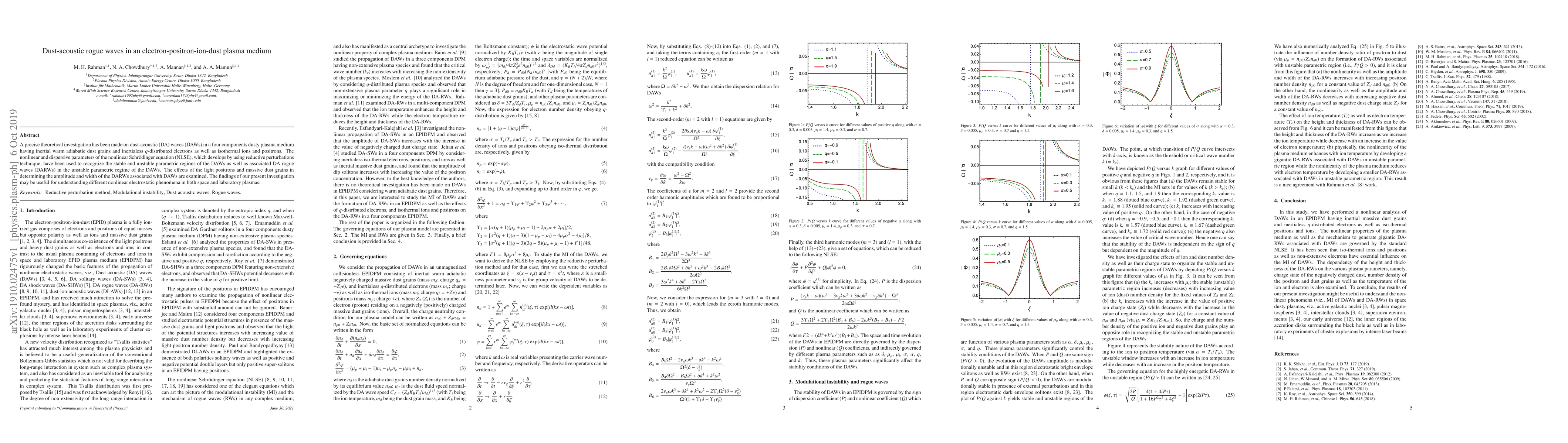 A precise theoretical investigation has been made on dust-acoustic (DA) waves (DAWs) in a four components dusty plasma medium having inertial warm adiabatic dust grains and inertialess $q$-distributed electrons as well as isothermal ions and positrons. The nonlinear and dispersive parameters of the nonlinear Schr\"{o}dinger equation (NLSE), which develops by using reductive perturbations technique, have been used to recognize the stable and unstable parametric regions of the DAWs as well as associated DA rogue waves (DARWs) in the unstable parametric regime of the DAWs. The effects of the light positrons and massive dust grains in determining the amplitude and width of the DARWs associated with DAWs are examined. The findings of our present investigation may be useful for understanding different nonlinear electrostatic phenomena in both space and laboratory plasmas.