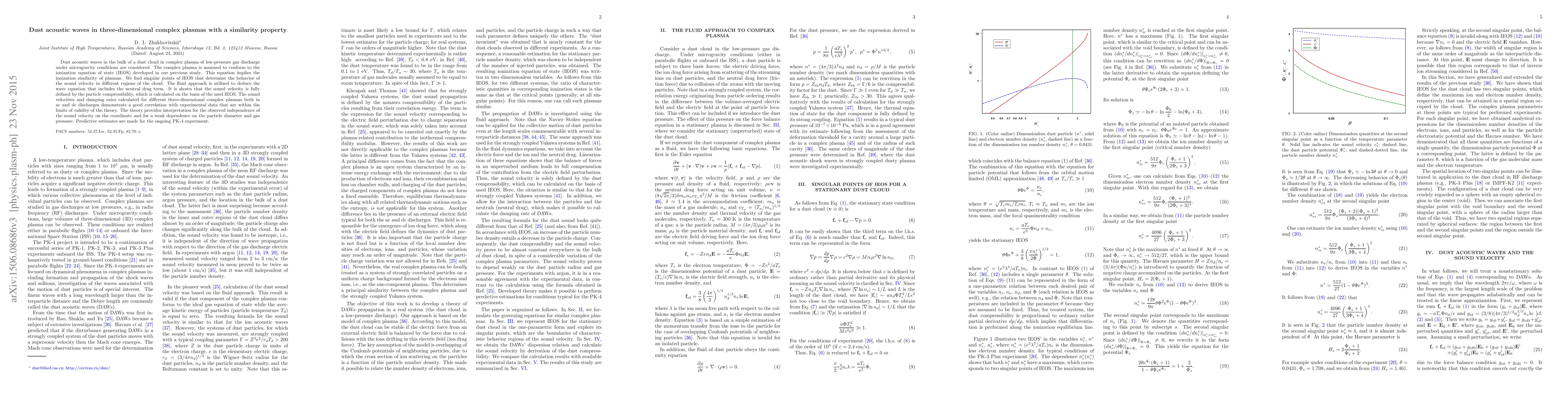 Dust acoustic waves in the bulk of a dust cloud in complex plasma of low-pressure gas discharge under microgravity conditions are considered. The complex plasma is assumed to conform to the ionization equation of state (IEOS) developed in our previous study. This equation implies the ionization similarity of plasmas. We find singular points of IEOS that determine the behavior of the sound velocity in different regions of the cloud. The fluid approach is utilized to deduce the wave equation that includes the neutral drag term. It is shown that the sound velocity is fully defined by the particle compressibility, which is calculated on the basis of the used IEOS. The sound velocities and damping rates calculated for different three-dimensional complex plasmas both in ac and dc discharges demonstrate a good correlation with experimental data that are within the limits of validity of the theory. The theory provides interpretation for the observed independence of the sound velocity on the coordinate and for a weak dependence on the particle diameter and gas pressure. Predictive estimates are made for the ongoing PK-4 experiment.